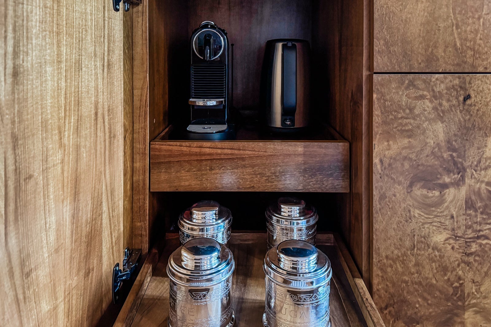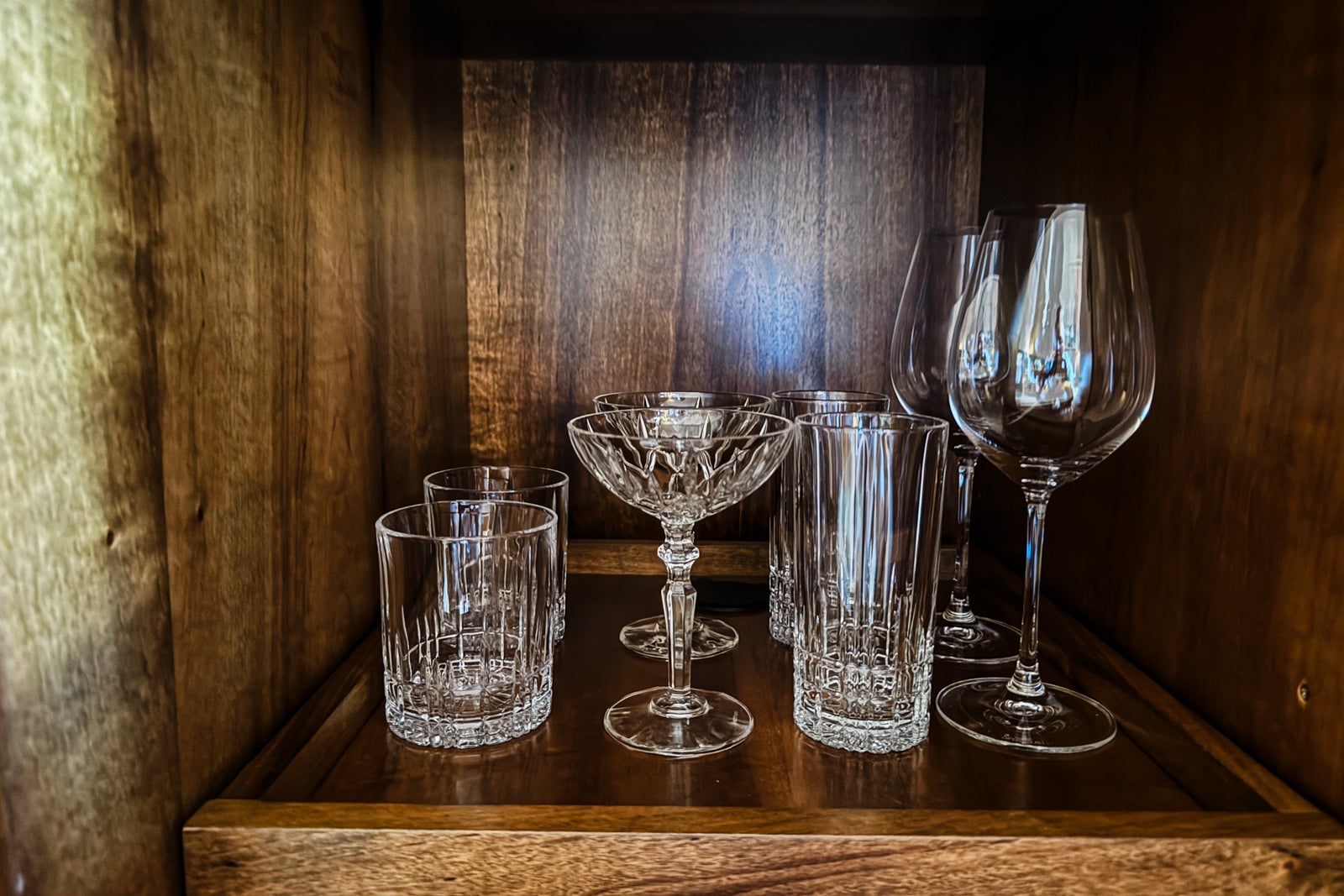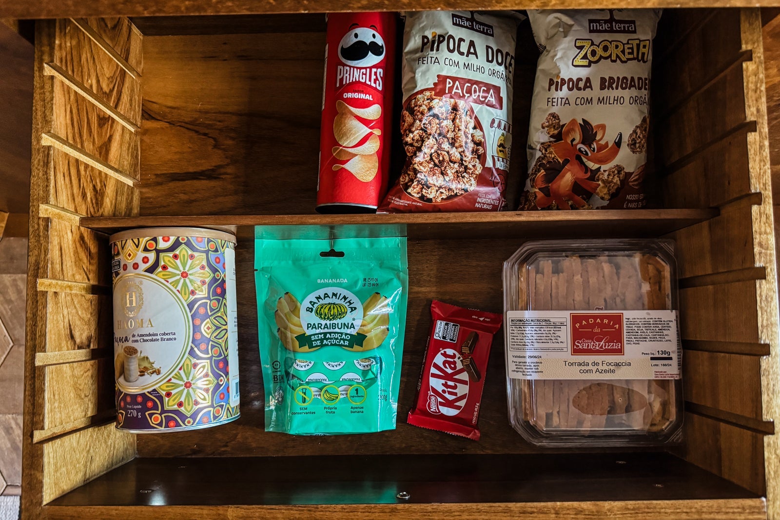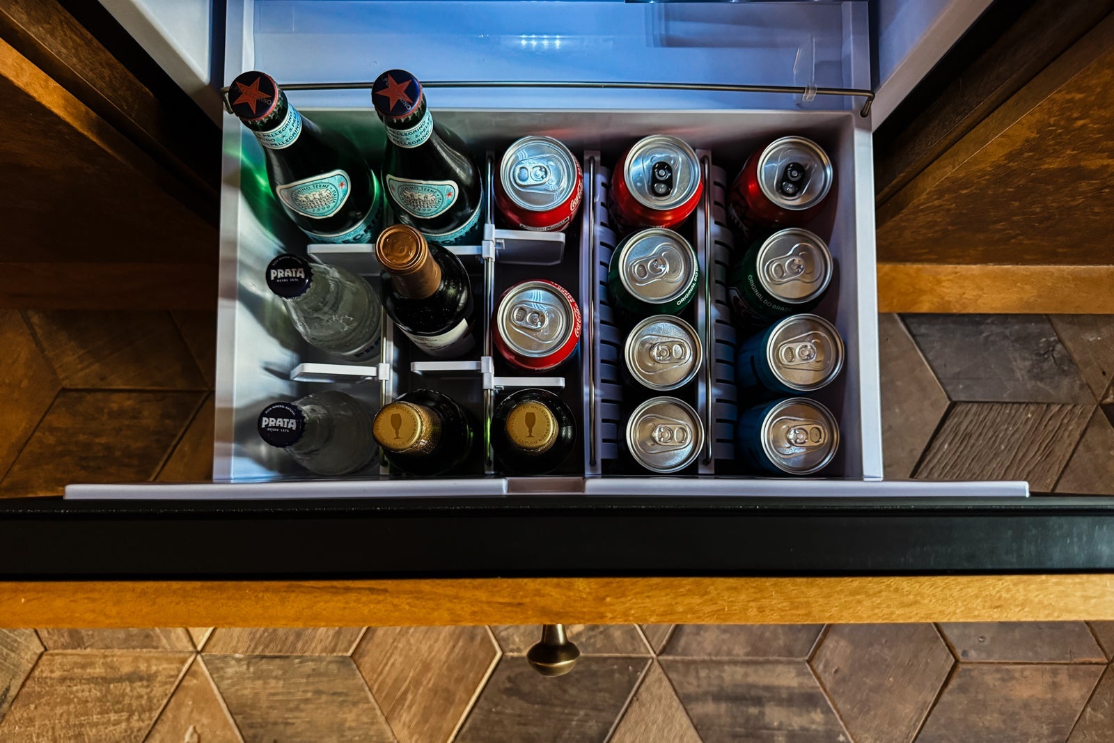 Inside one side of the hutch was a coffee cabinet housing a Nespresso machine and freshly baked cookies as well as sugar and cream. Another drawer slid out to reveal a built-in minifridge featuring a variety of sodas, including Coke and a couple of local Brazilian options, as well as San Pellegrino sparkling water, still water, beer and more wine. There was another drawer with snacks, and then the right side of the hutch housed more glassware — beautiful cocktail and wine glasses for enjoying the beverages on offer. Note that the snacks and drinks are available for a fee, though there was no minibar menu with pricing in the room.