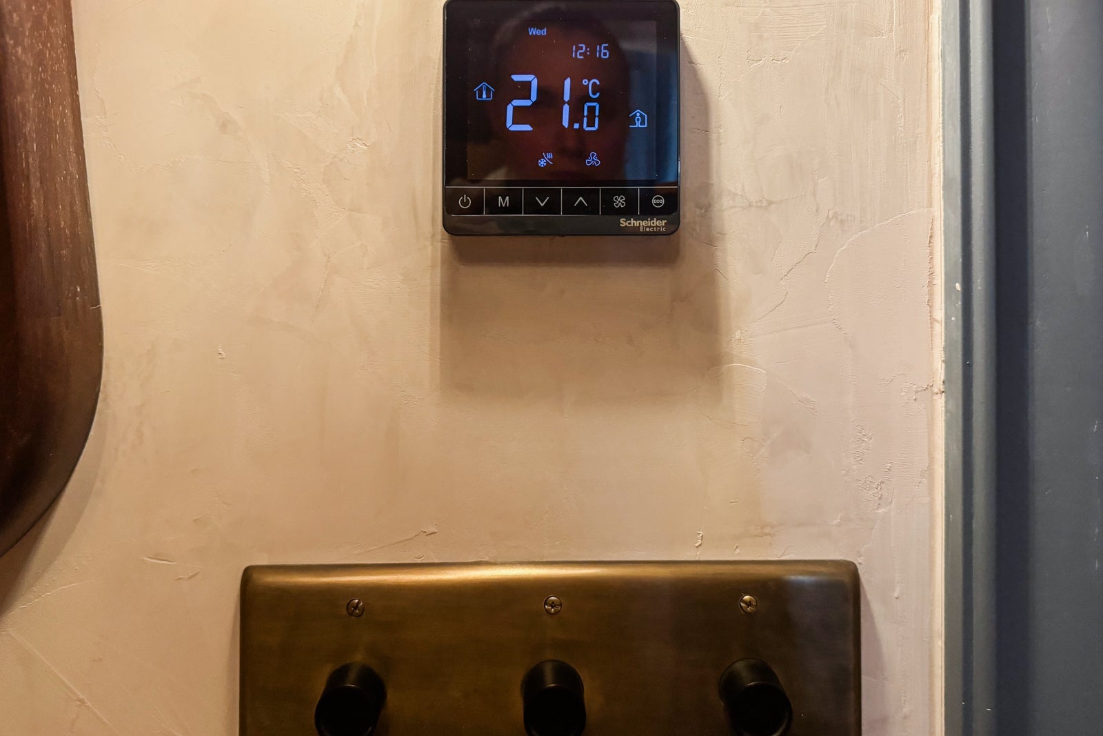 A master light switch feature to the left of the doorway controlled all the lights in both the bathroom and the bedroom.