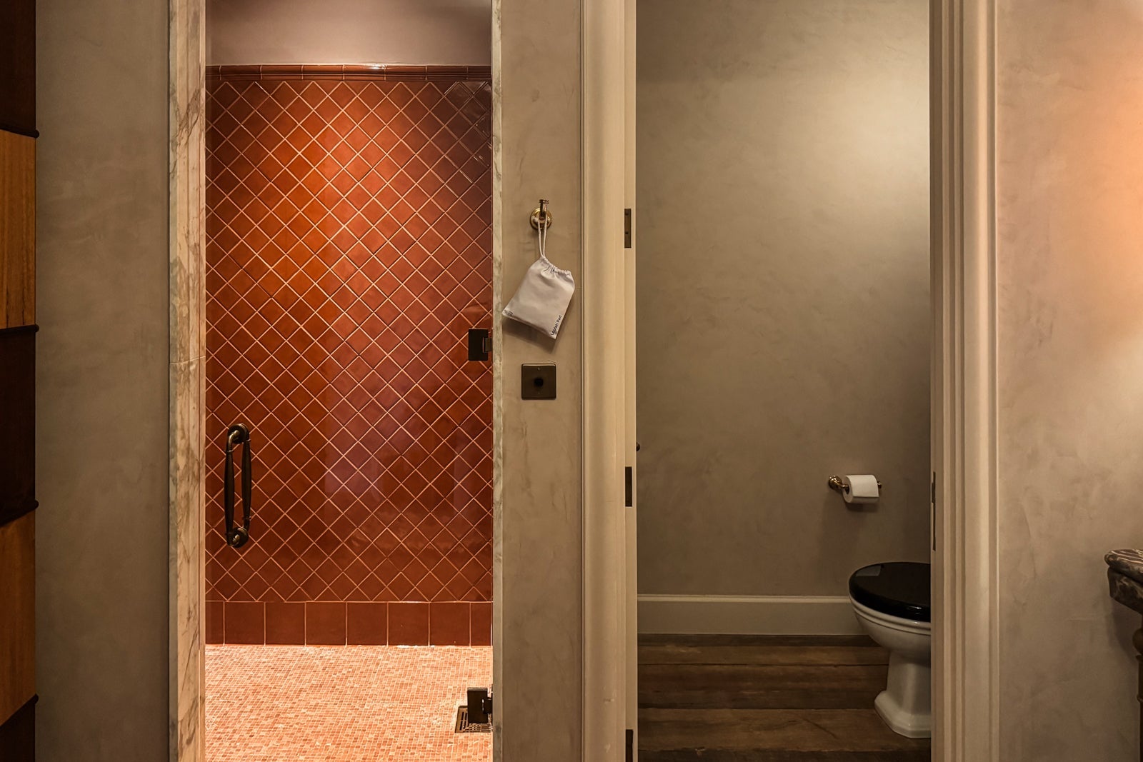 There was a small, separate wash closet with a toilet off the main bathroom, and the shower was on the other side of the wash closet. The interior of the shower featured beautiful clay-red wall tiling juxtaposed with smaller, lighter pink tiles on the floor. Guests can rinse off with either a removable wand or an overhead rain shower fixture.