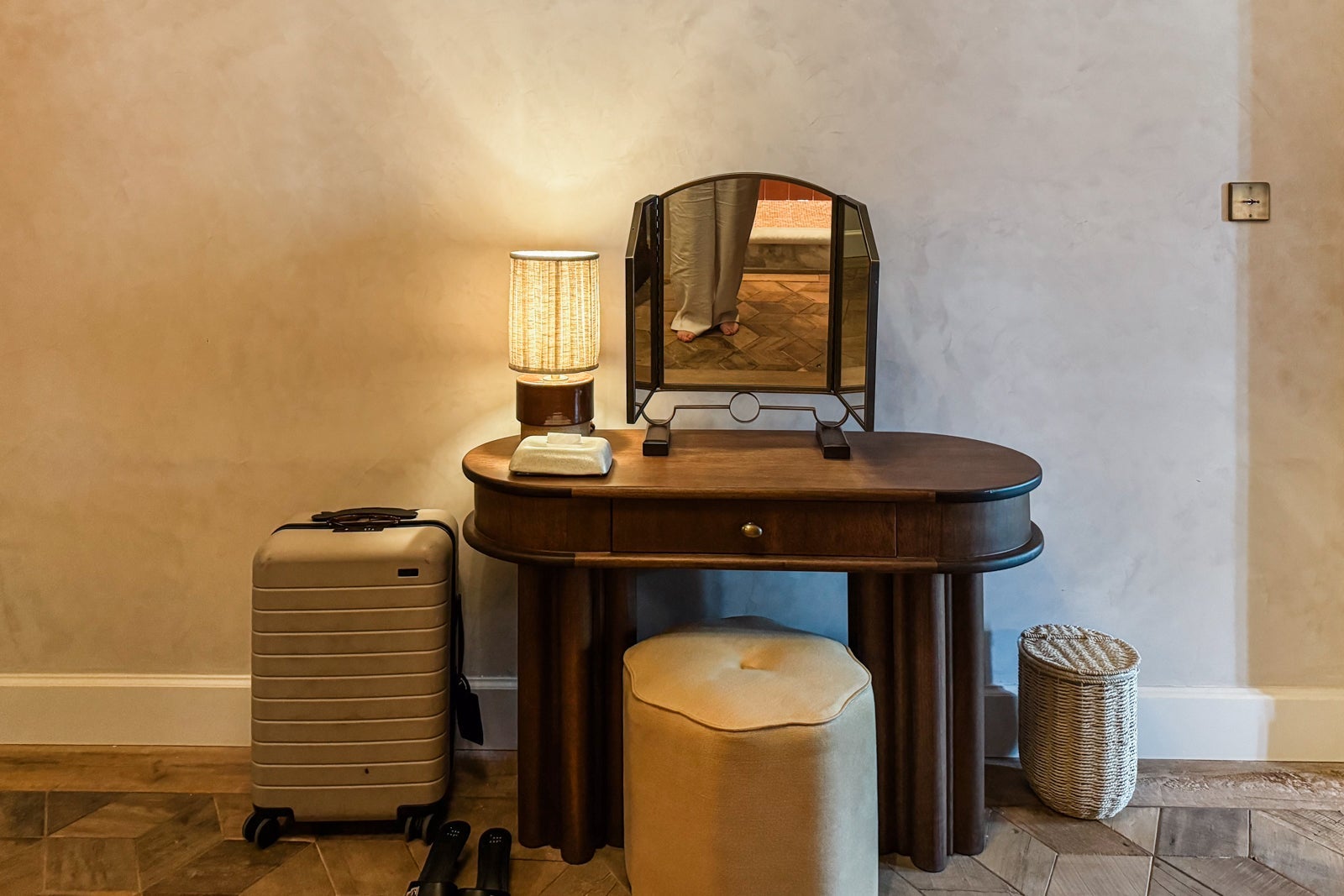 The bathroom also had a small vanity with a seat and mirror. The mirror was a bit wobbly, though, which put me off from using the area — I was worried if I touched the table, the mirror may fall over (it looked antique and fragile).