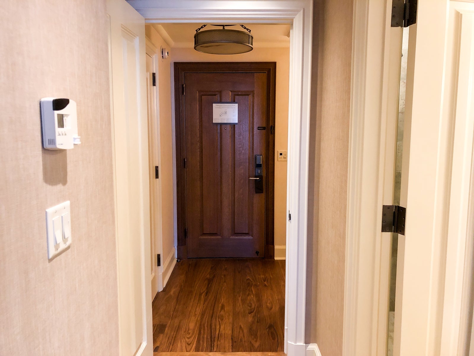 The entrance to the room had a small foyer with a wood floor and doors that could go to other connecting rooms. It served as the perfect storage area for our ski gear.