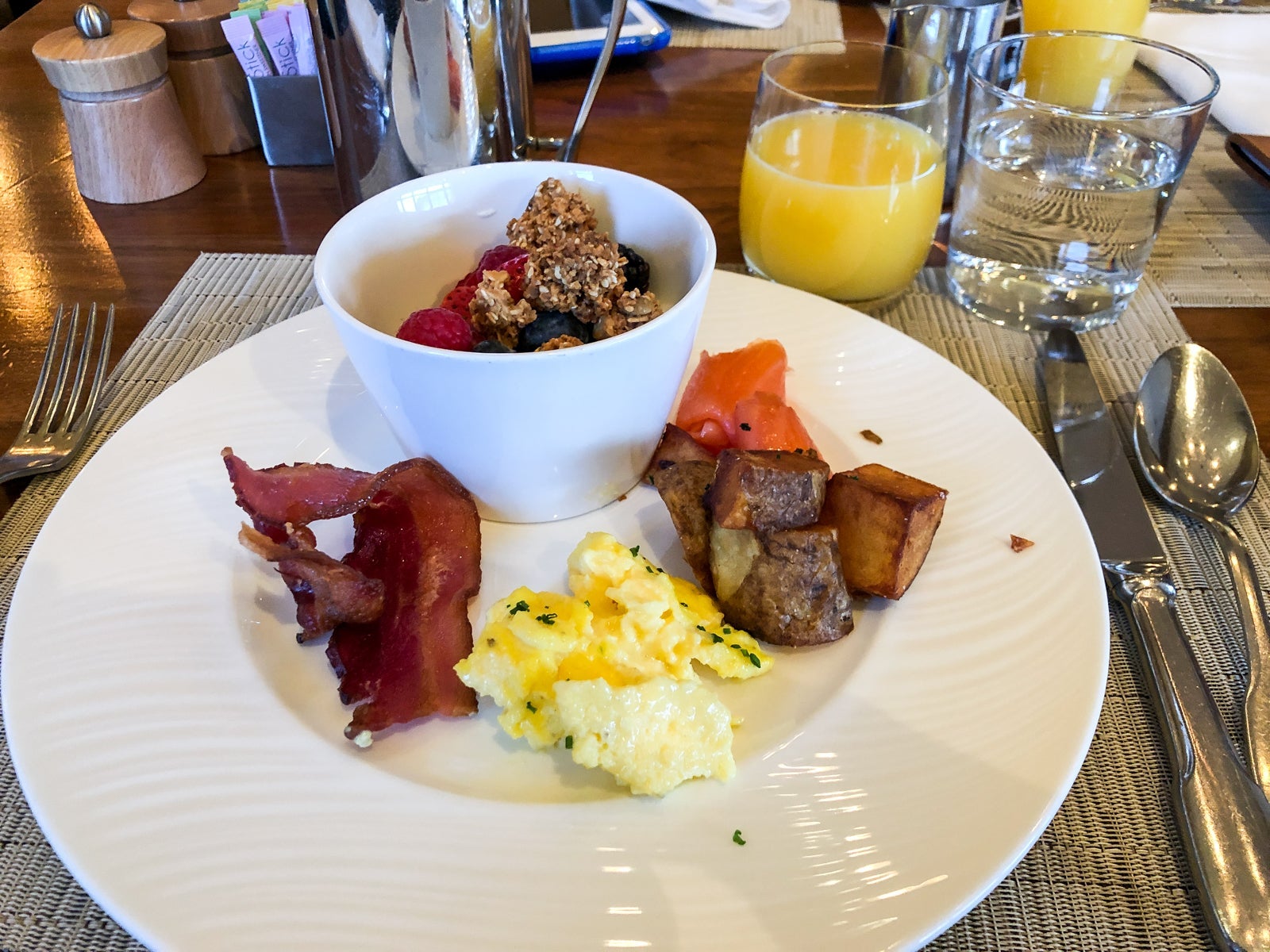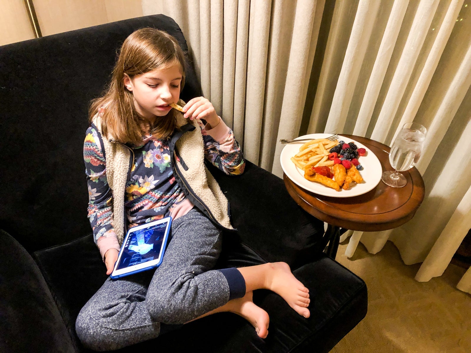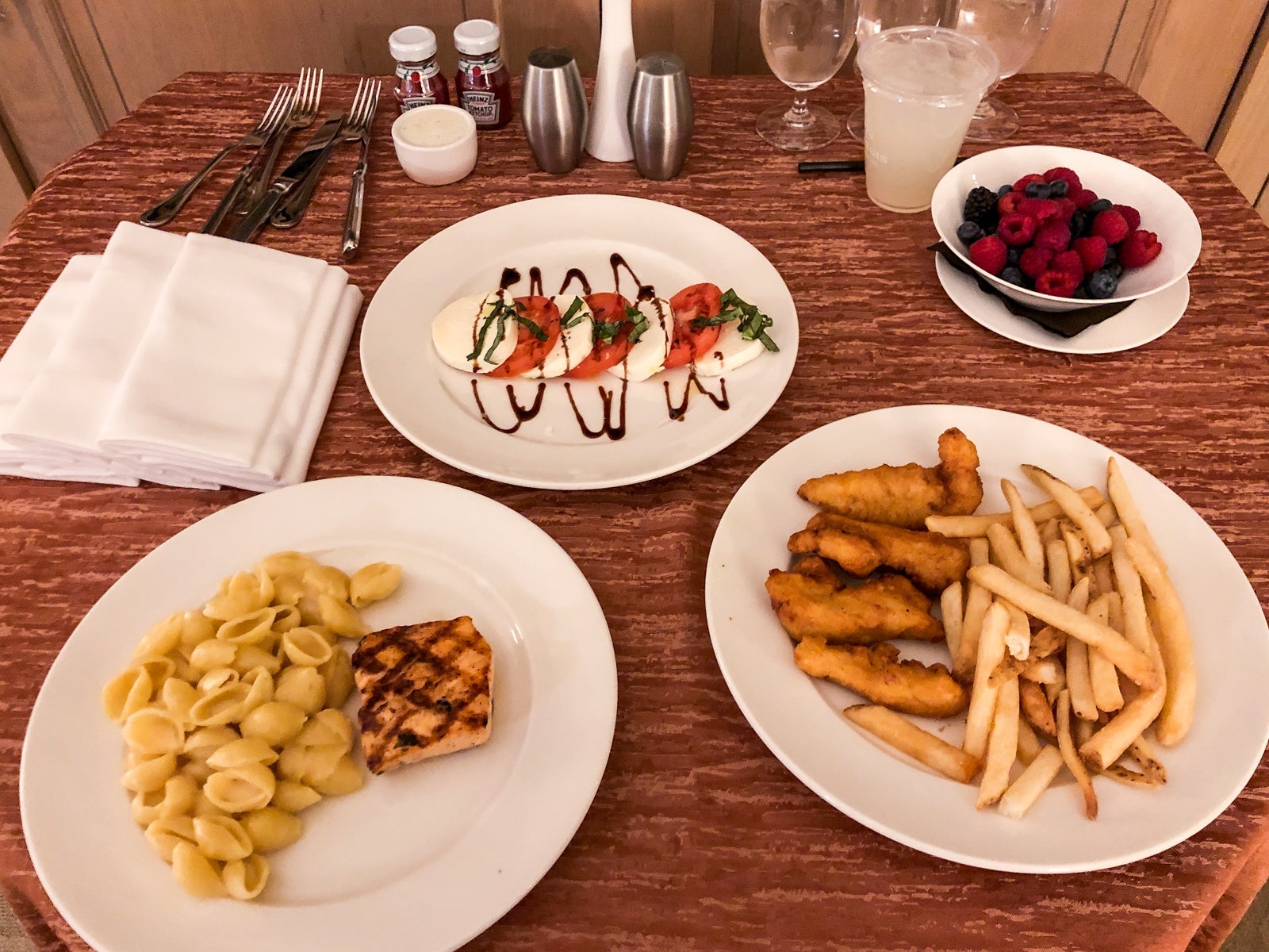 Other than breakfast in the J&G Grill, our other onsite meal was dinner via room service, since there was no other option (and one kid was down for the count by this point). The Caprese salad and the berries were very good, and the kids enjoyed their kid meals.