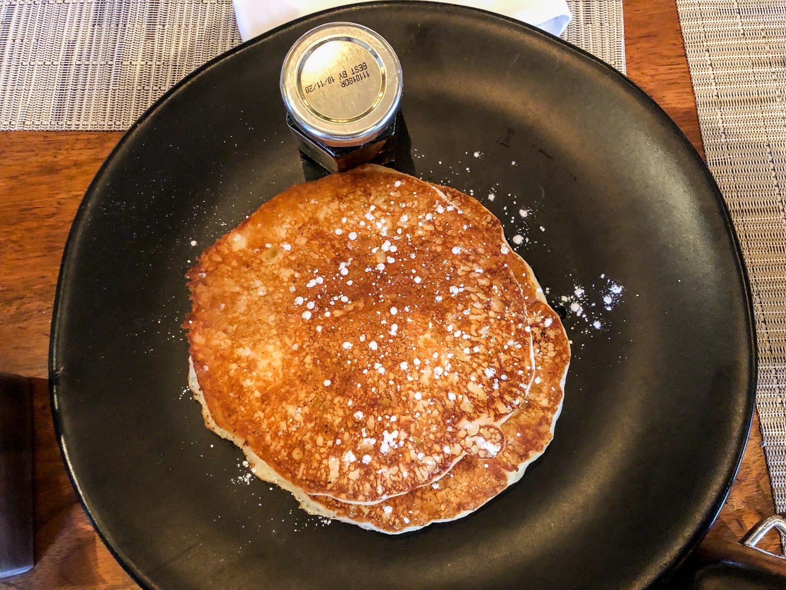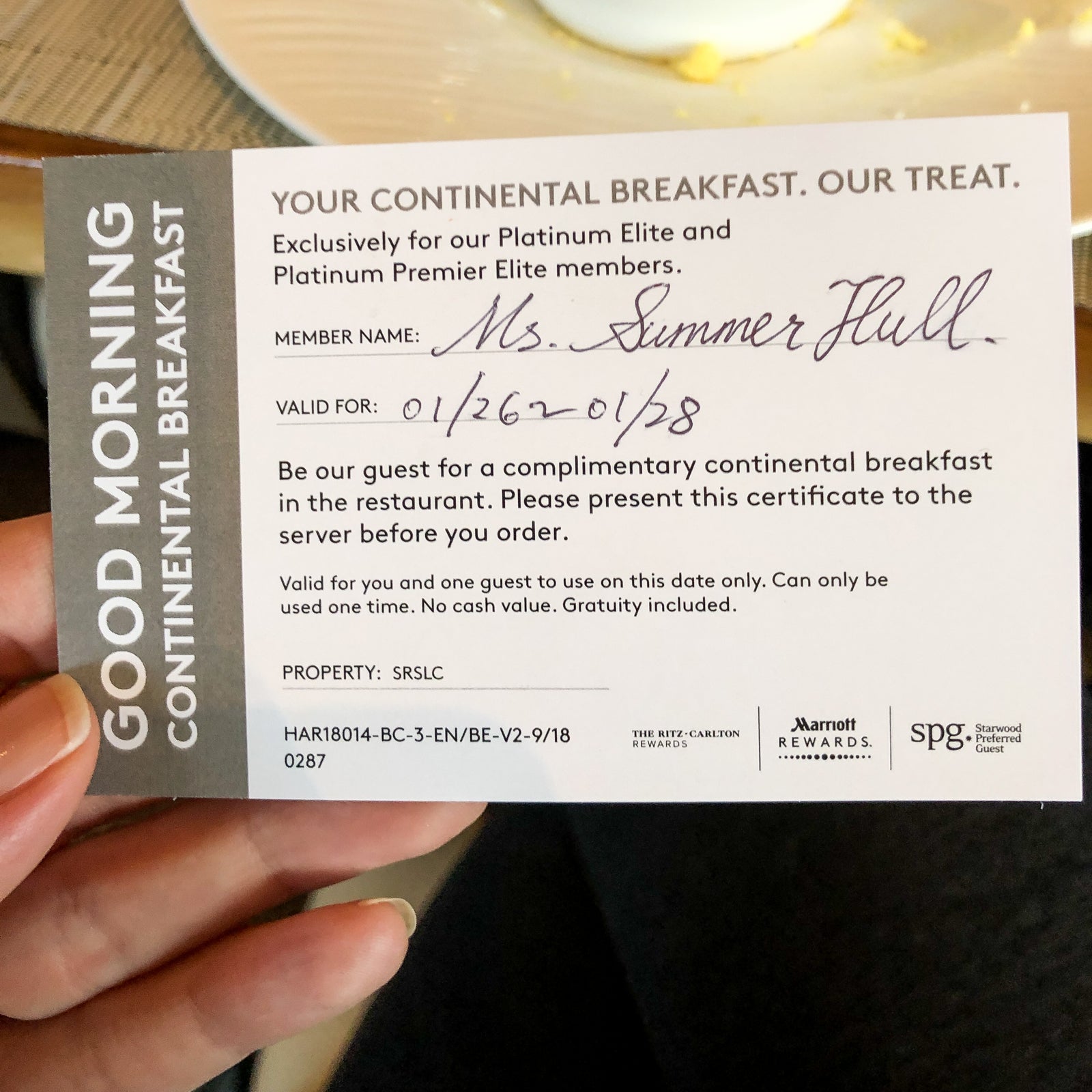 Marriott Platinum status covered breakfast for two in the restaurant. The card said complimentary continental breakfast, but we were invited to enjoy the full buffet at no additional charge. We could also add items, such as pancakes, from the menu with no surcharge. If we were paying with cash, the adult buffet would have been $38 and a child's buffet $25.