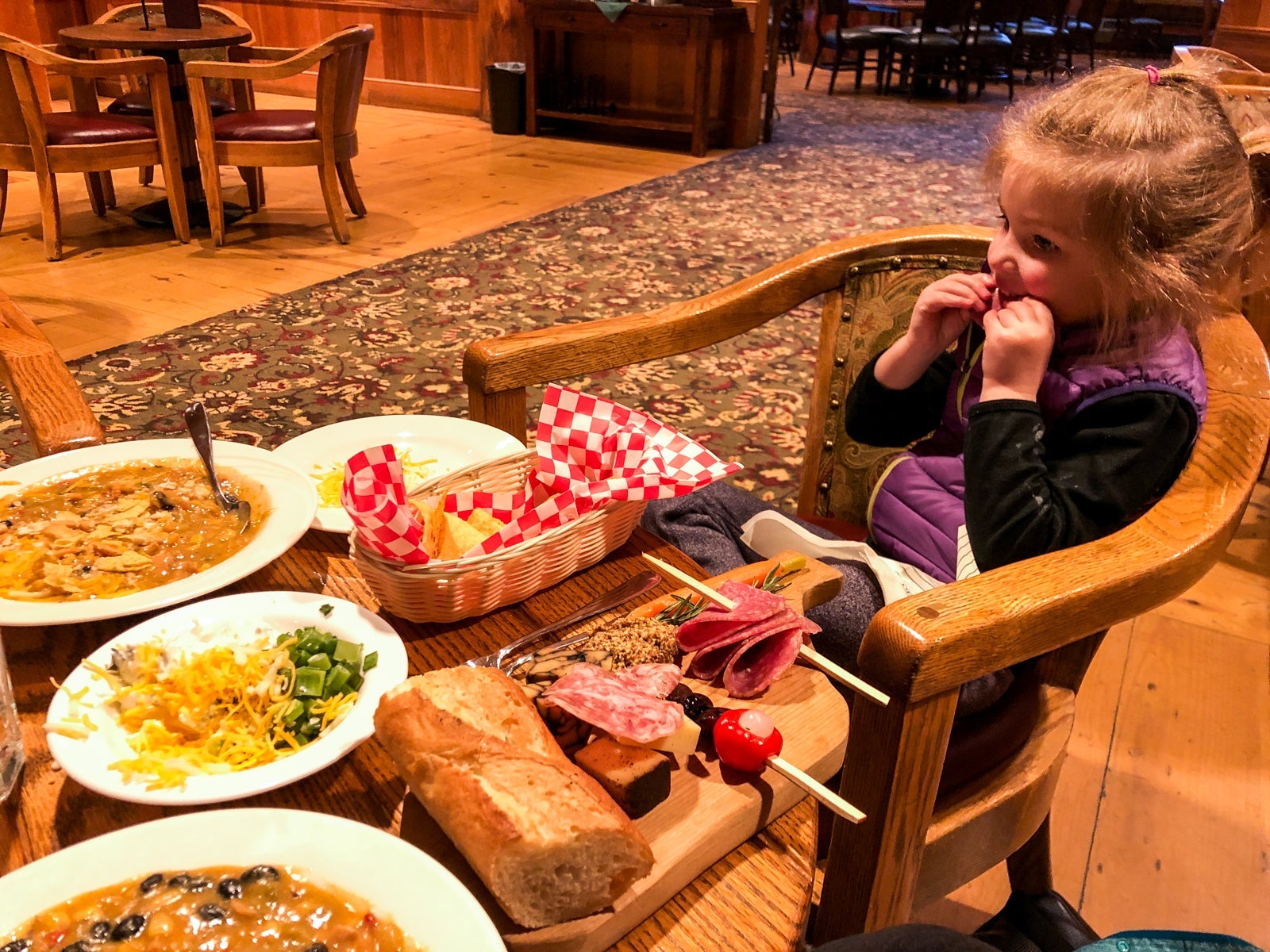 On our second evening, we ate dinner immediately after picking up our 9-year-old from her ski camp at the ski lodge.