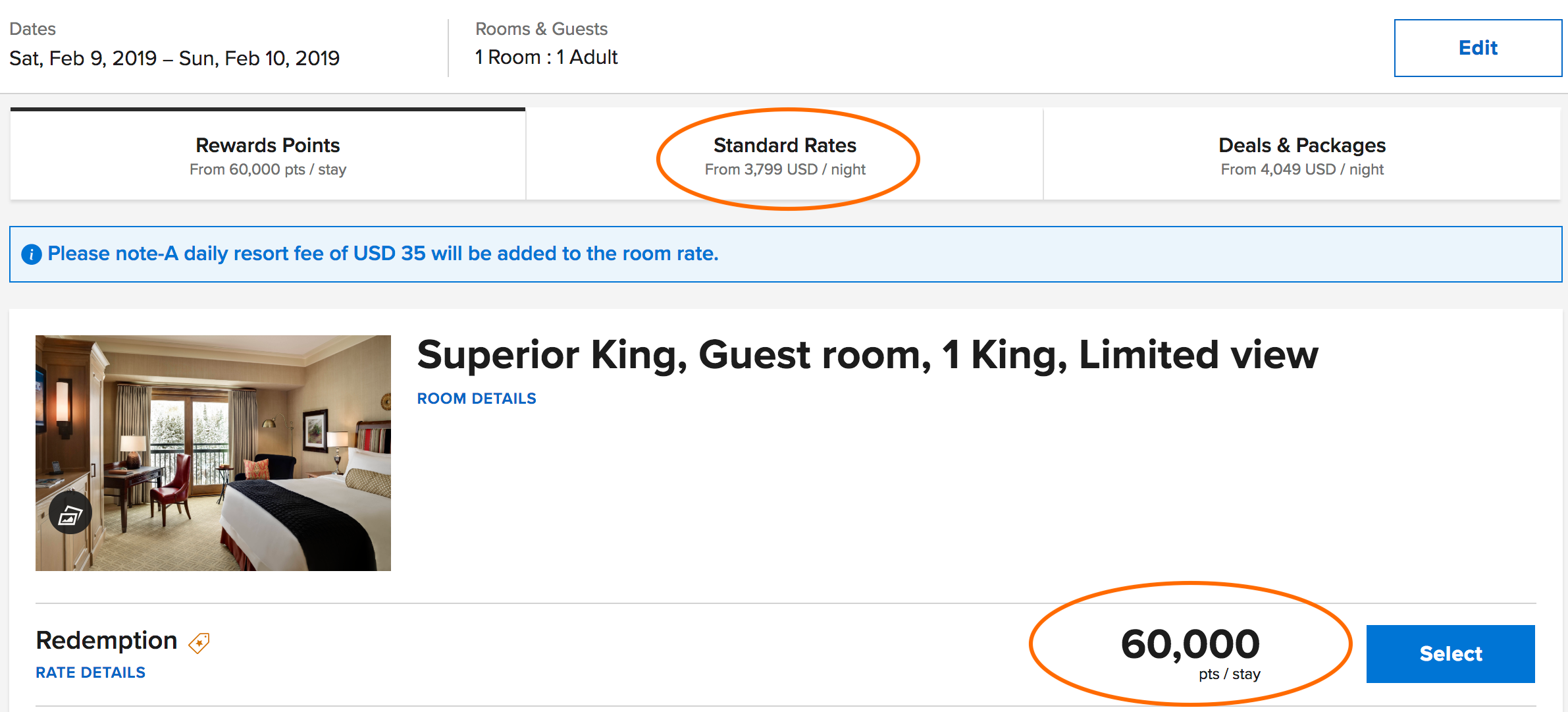 The standard room at this hotel was a superior king room rated for three people. They did offer to bring in a rollaway bed, but one king bed was fine for the girls and me. I did see dates that had a room with two queens available for four people for a few thousand additional points, though that was largely during the off-season. There was also a $35-per-day resort fee and $35-per-day parking fee to factor into the equation.