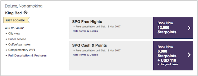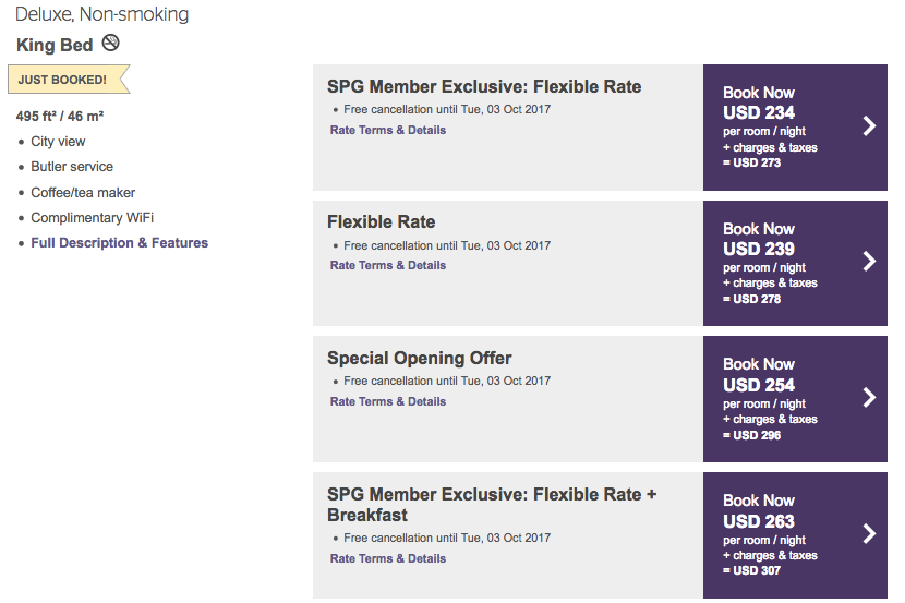 I was only going to spend a single night at the property, so I decided to book a standard room, or what the hotel calls deluxe. There were a number of possible rates, but I went for the lowest, the SPG Member Exclusive Flexible Rate, because it was $5 cheaper than even the normal flexible rate.