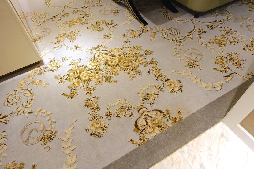 The carpet, which was silvery blue with brown-and-gold floral motifs, was especially pretty, and I liked the recessed ceiling and lighting.