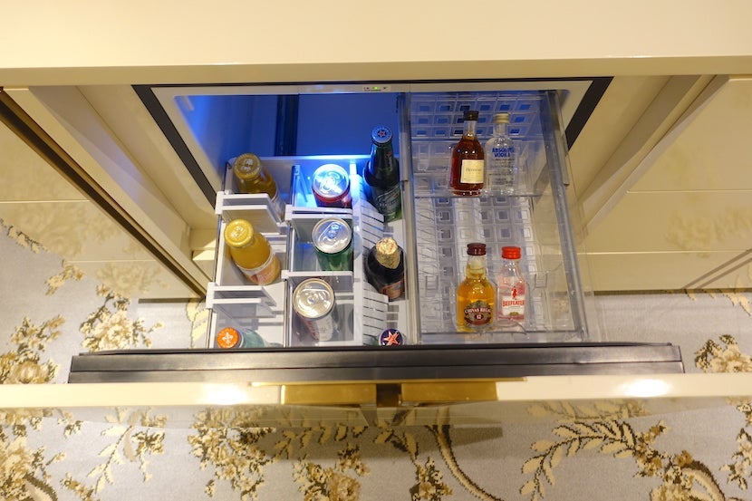 The minibar was in the chest's drawers. One drawer was refrigerated and held a selection of beverages.