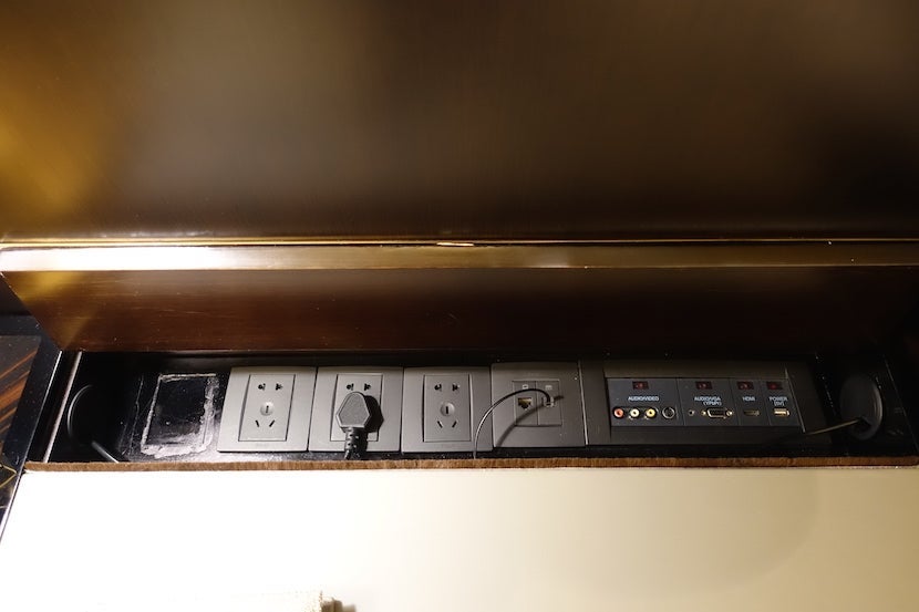 Hidden in a panel on the desk that you had to practically yank to open was a set of plugs and A/V inputs. It looked shoddily finished, thanks to the crude caulking.