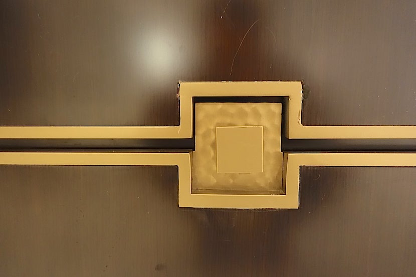 The aesthetic was clubby, with heavy wooden desks, tufted leather armchairs and gilded, glass-fronted chinoiserie armoires.