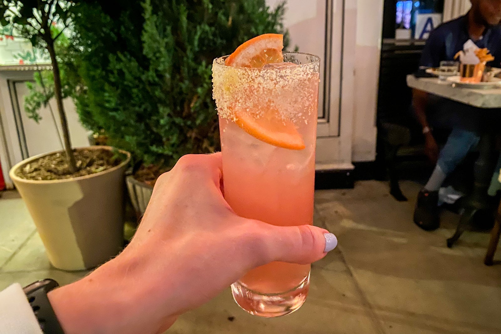 To accompany our entrees, we ordered sides of crispy potatoes with smoked paprika aioli ($9), french fries ($8) and a pickle ($3) for a good crunch; we also ordered a Rosa Paloma cocktail made with blanco tequila, rosa aperitif, pink grapefruit, lime and passionfruit salt ($16).
