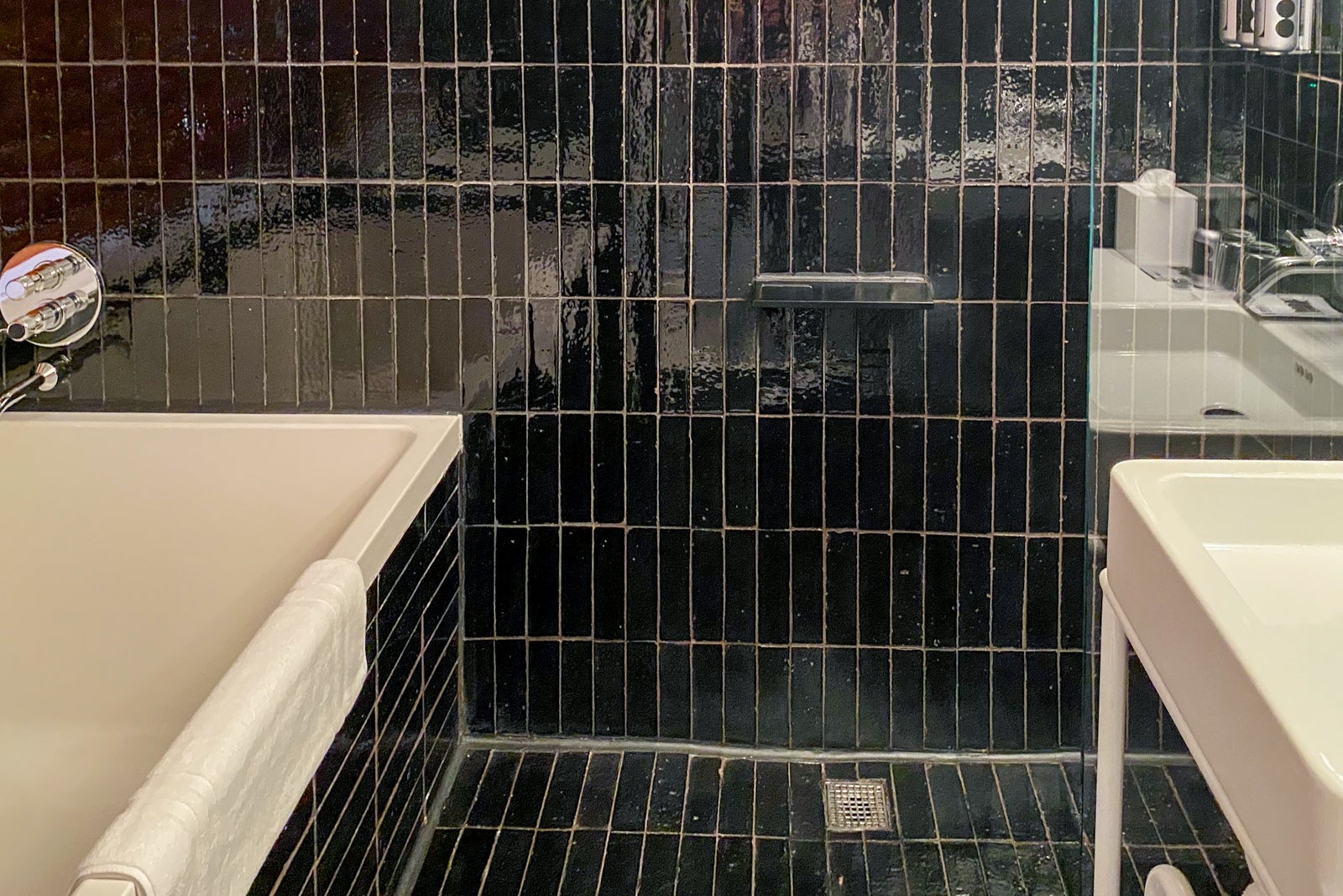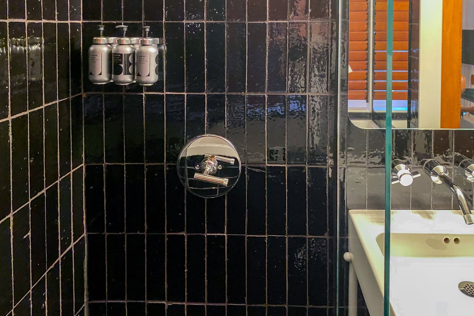 The bathroom continues the retro-yet-modern aesthetic, though with a few subpar design choices. Handmade black, cream and orange tiles cover the floor, walls and sides of a bathtub and an exposed shower. The toilet and the trash can, which is too small to hold more than a couple of tissues, sit out of view in a small water closet. The hotel supplies its own Standard branded body wash, shampoo and conditioner.