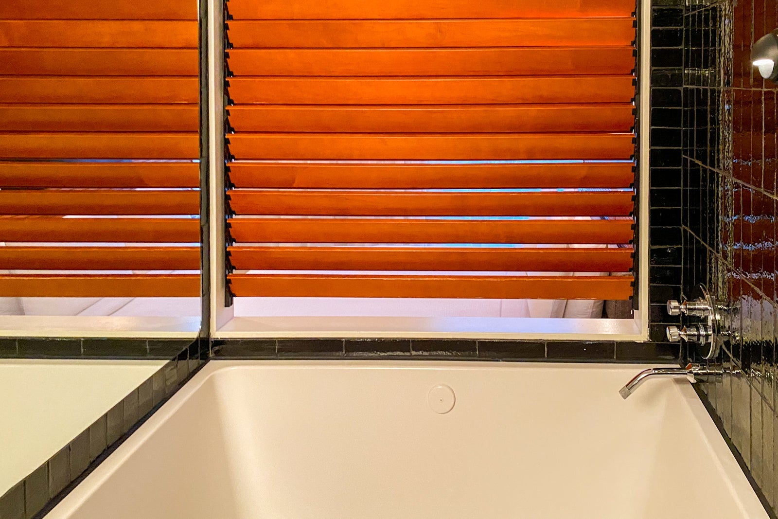 Above the tub is a window facing the bed and the view beyond, a quirky feature that you'll likely either love or hate. I appreciated its design for the exterior view it gave and didn't mind it for my solo stay. However, those staying with another guest might find this to be awkward for privacy purposes.