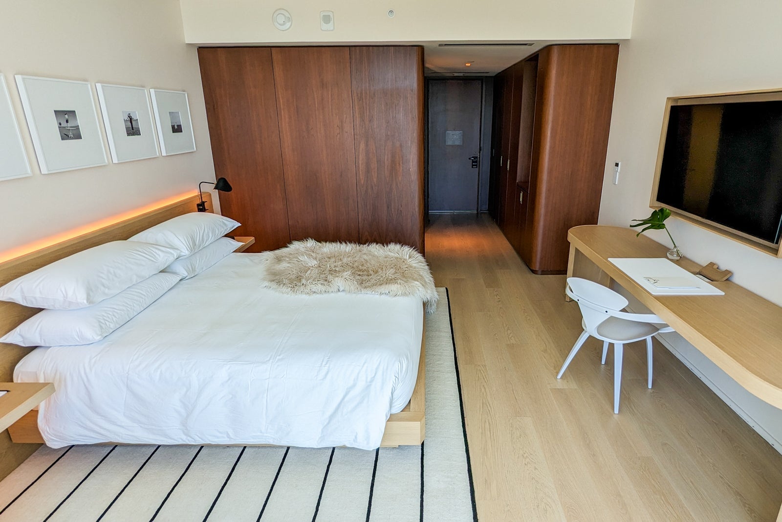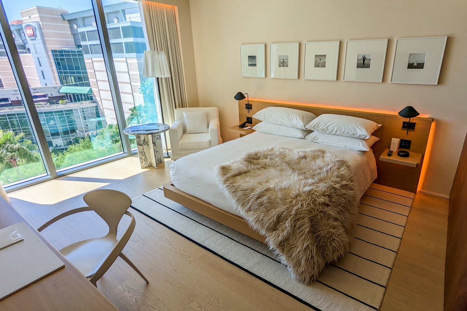 There are plenty of light, airy design choices, from the white bedding and upholstered chair to the signature Edition faux-fur throw, all of which reflect the sunshine flooding through the floor-to-ceiling windows. Black accents (think: a series of abstract black photographs, a black-and-white marble table and a white rug with black stripes) give the space definition and contrast.
