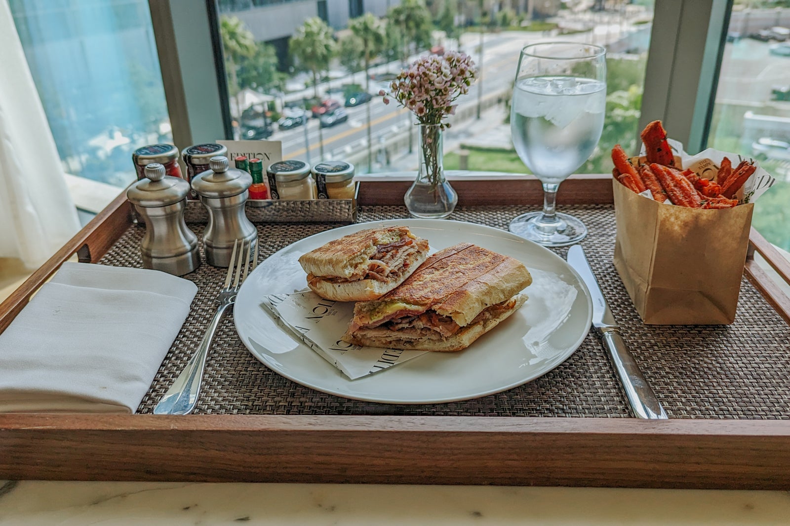 Room service also features simple but tasty dishes like a Cuban sandwich with sweet potato fries. The city of Tampa claims to be the birthplace of this world-famous sliced meat-and-cheese-filled snack, though Miami and Cuba may vehemently disagree.