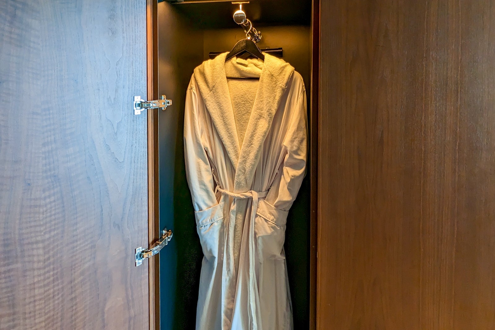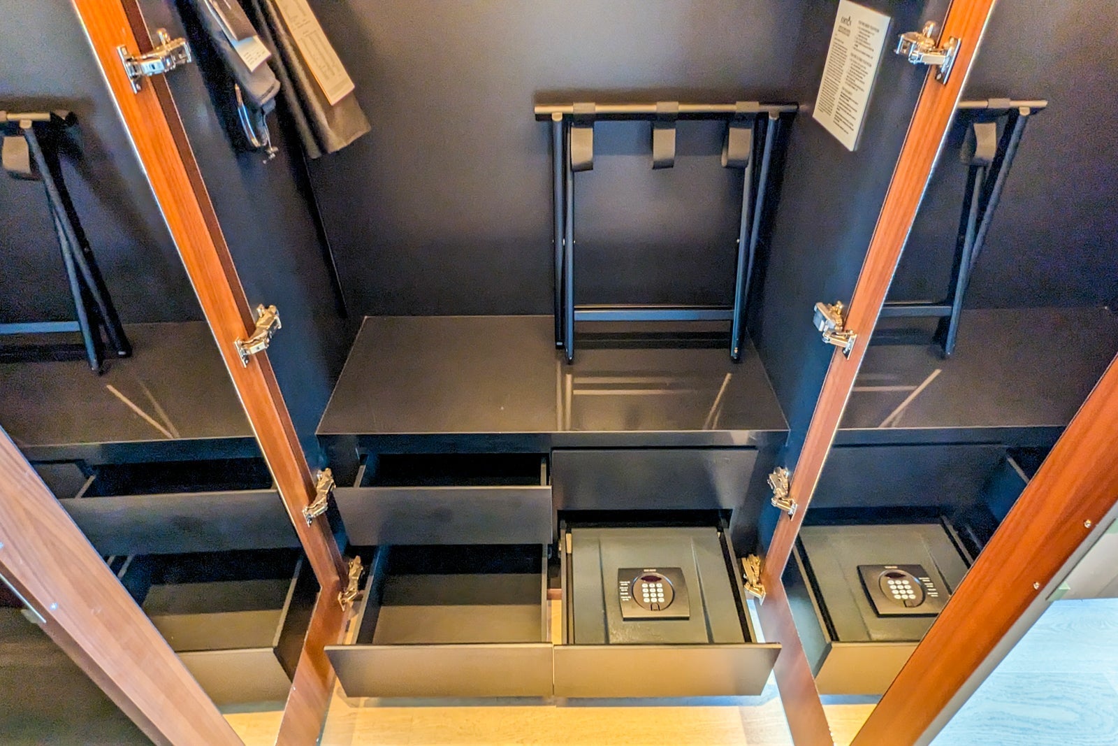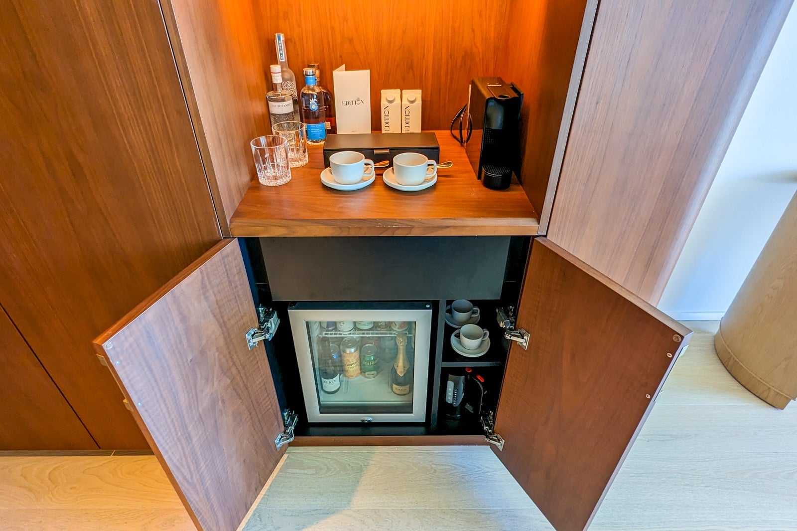 Everything feels unfussy and harmonious, with the gold cupboard and draw handles on the wardrobe and the minibar echoing the hardware in the bathroom and adding high-end finishes throughout the room.