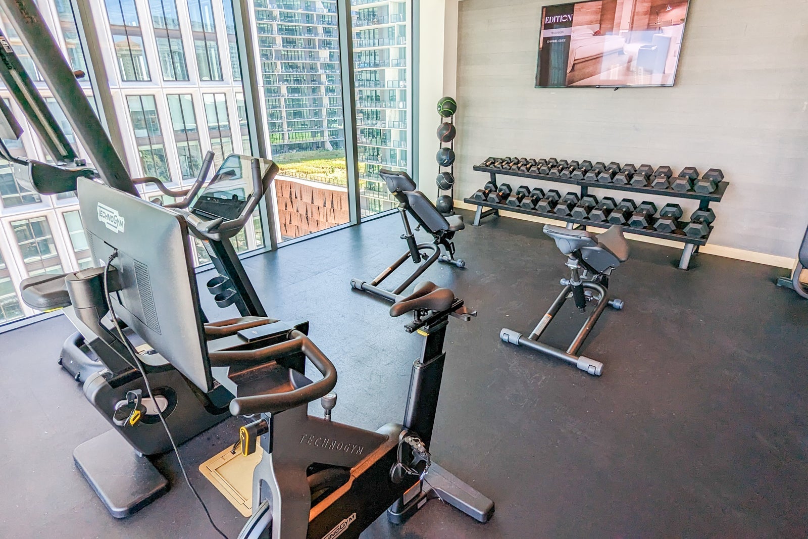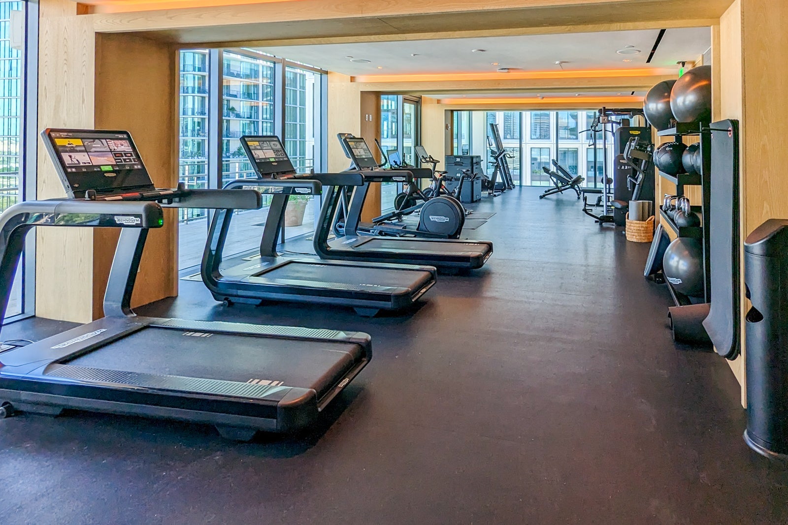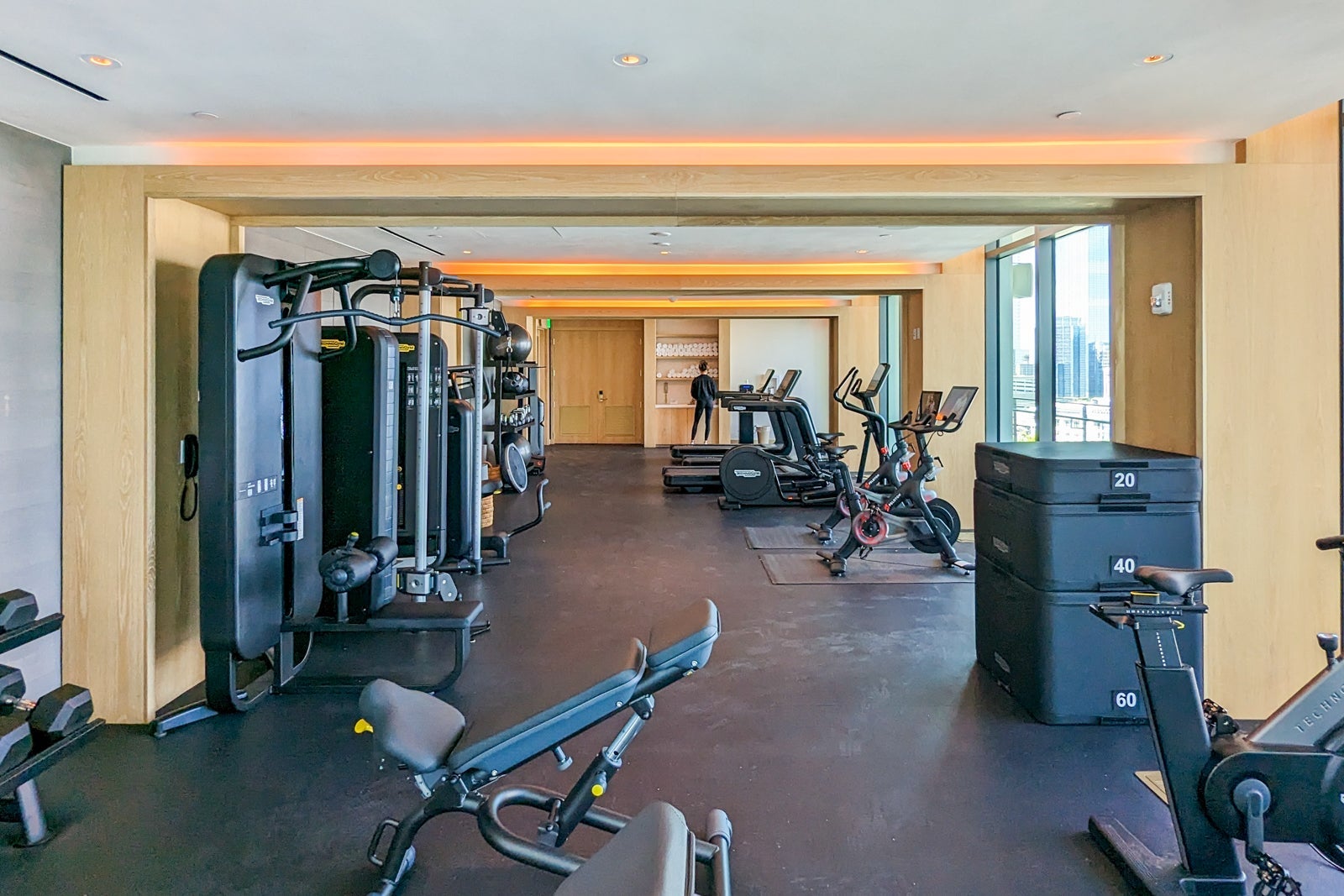 Also on the ninth floor is a well-equipped gym with great natural light and views of the nearby downtown area.
