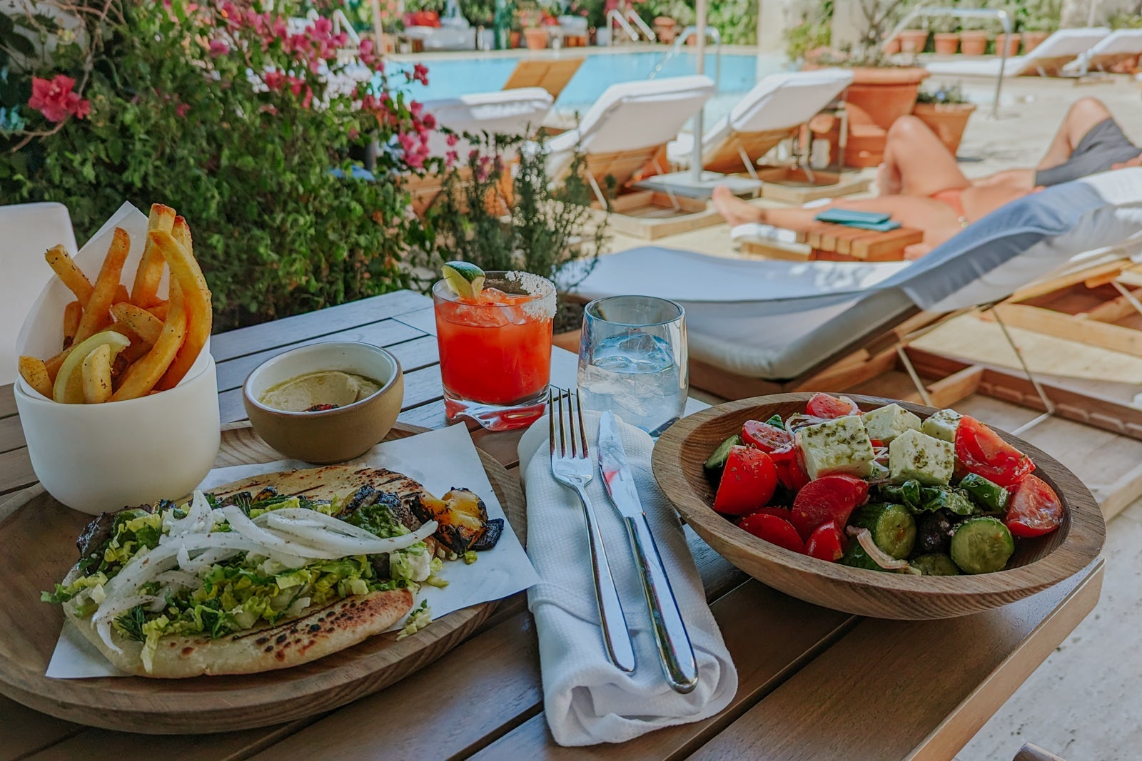 The poolside Azure restaurant offers classics like Greek salad and a juicy marinated filet mignon kebab souvlaki served on pita with french fries and hummus.