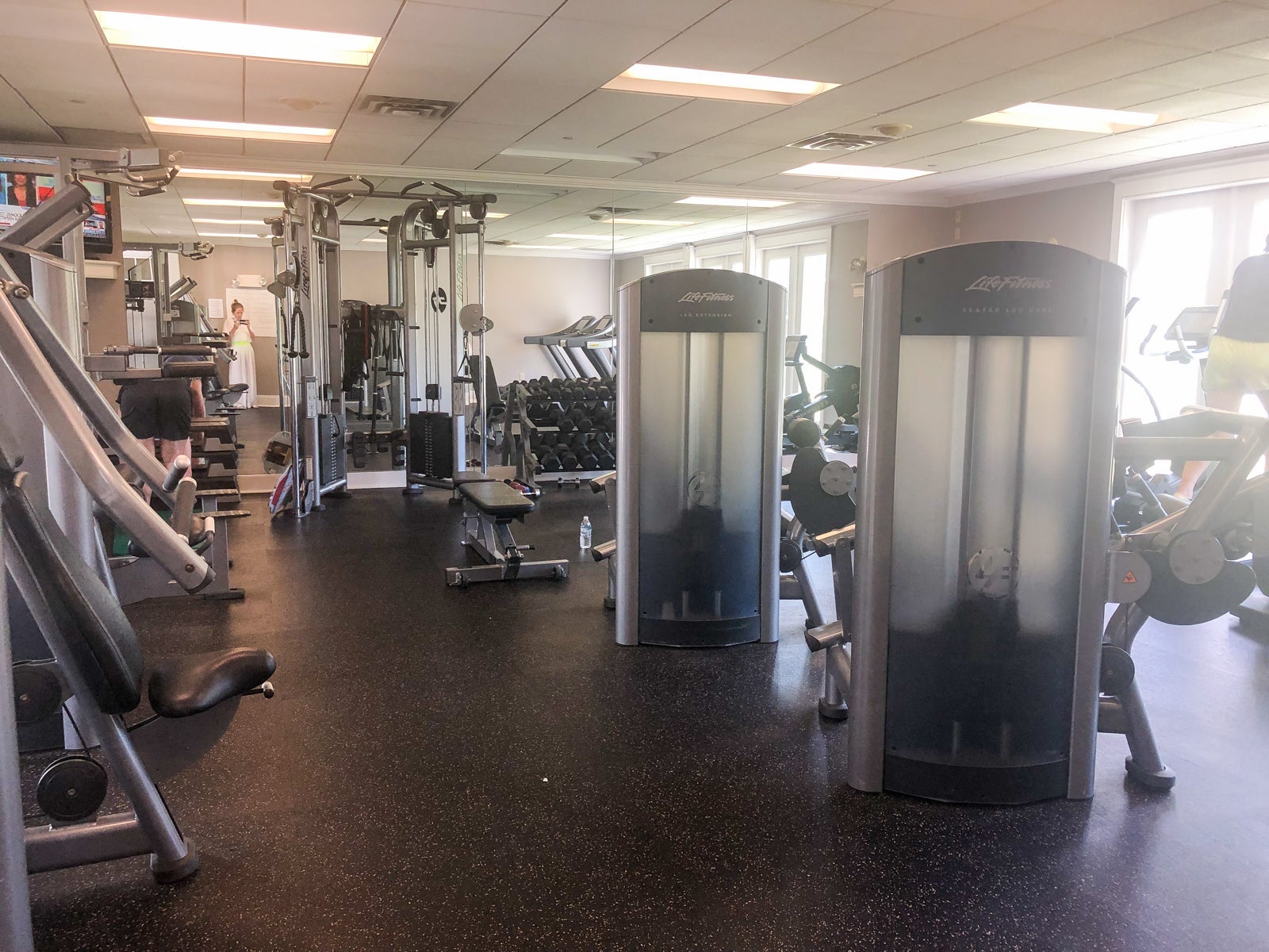 A large gym with different kinds of weight and fitness equipment was near the pool area.