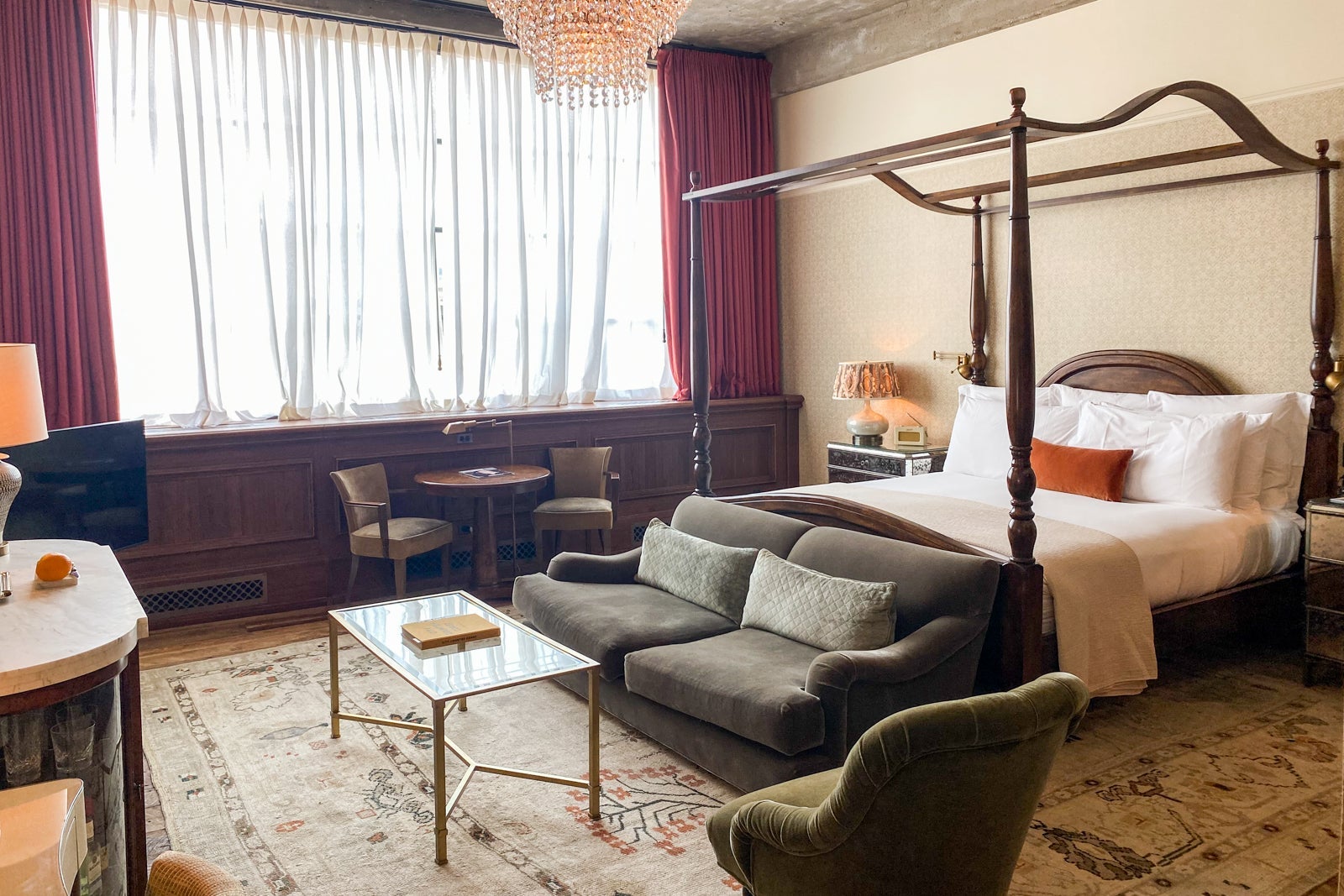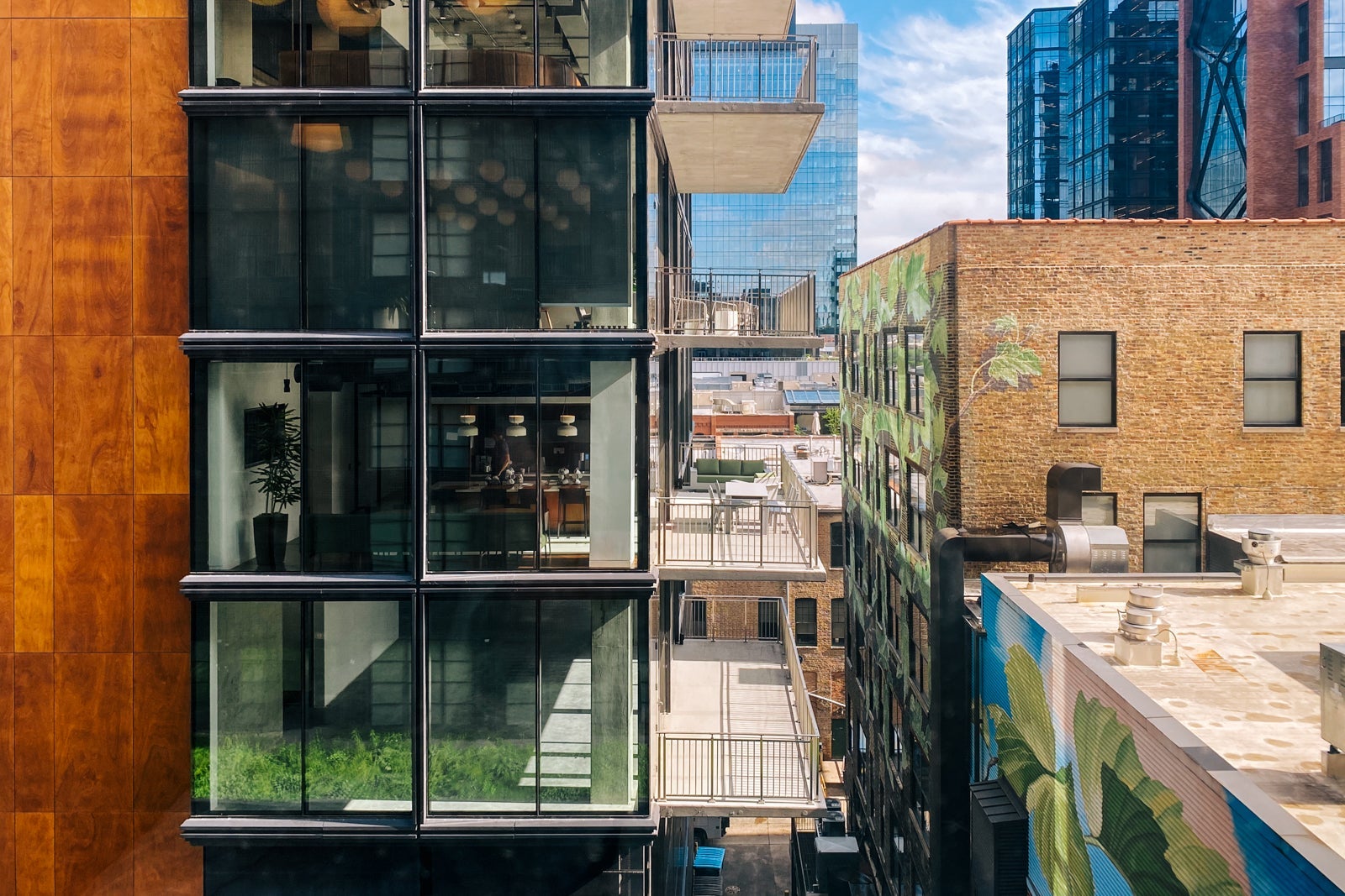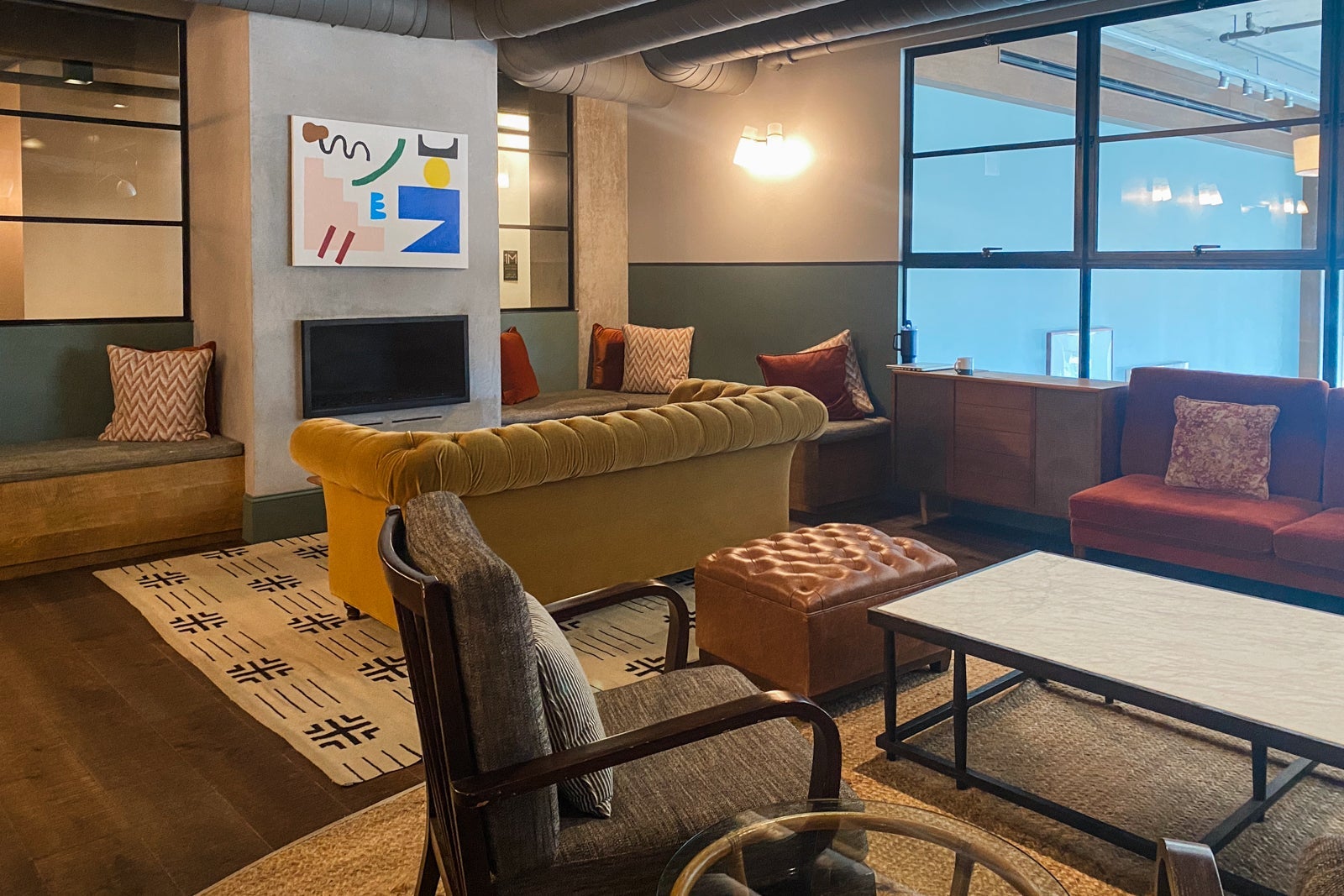 At the Chicago property, local artists are featured throughout industrial-style spaces that are marked by midcentury furniture and warehouse-style floor-to-ceiling windows that let in plenty of natural light.