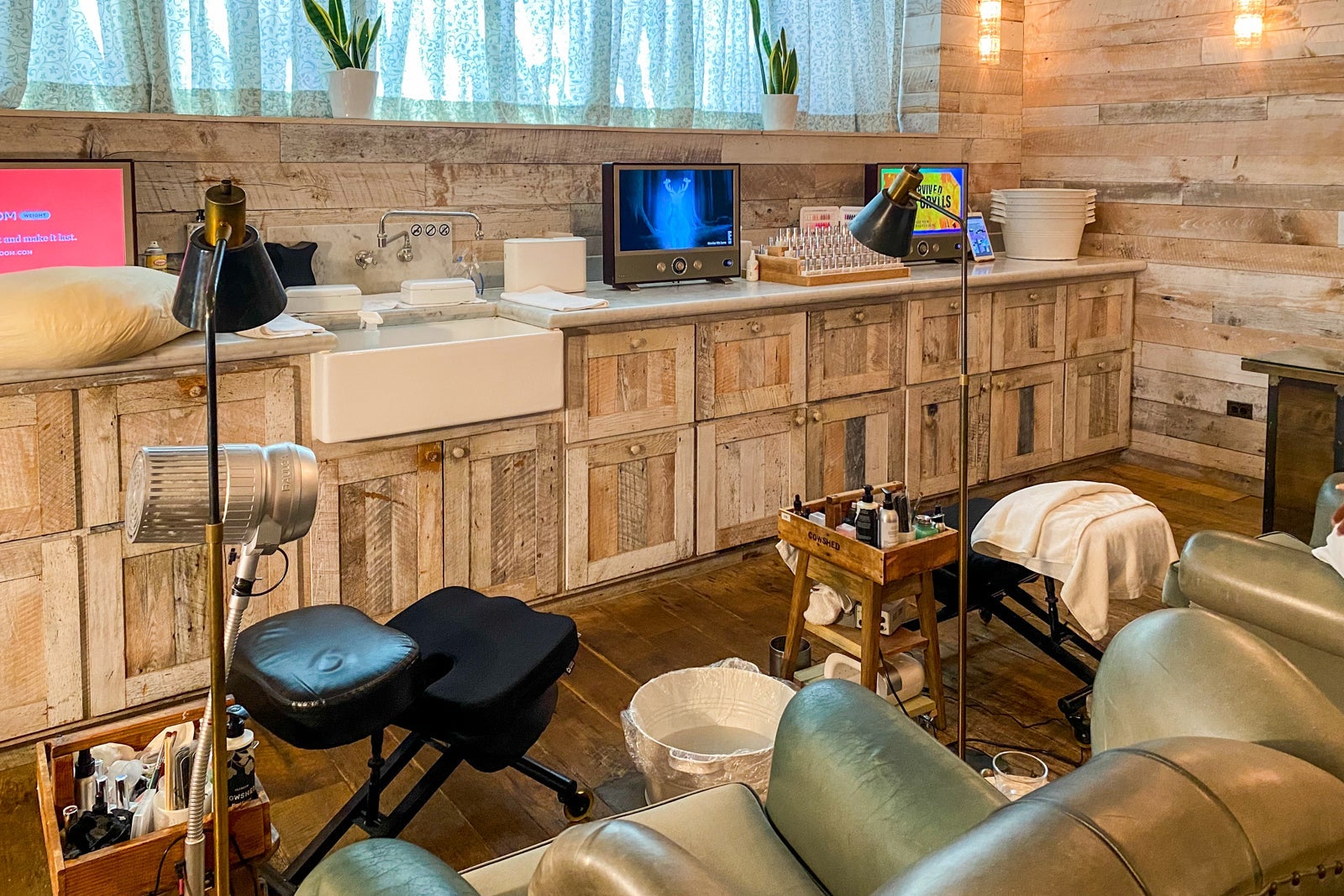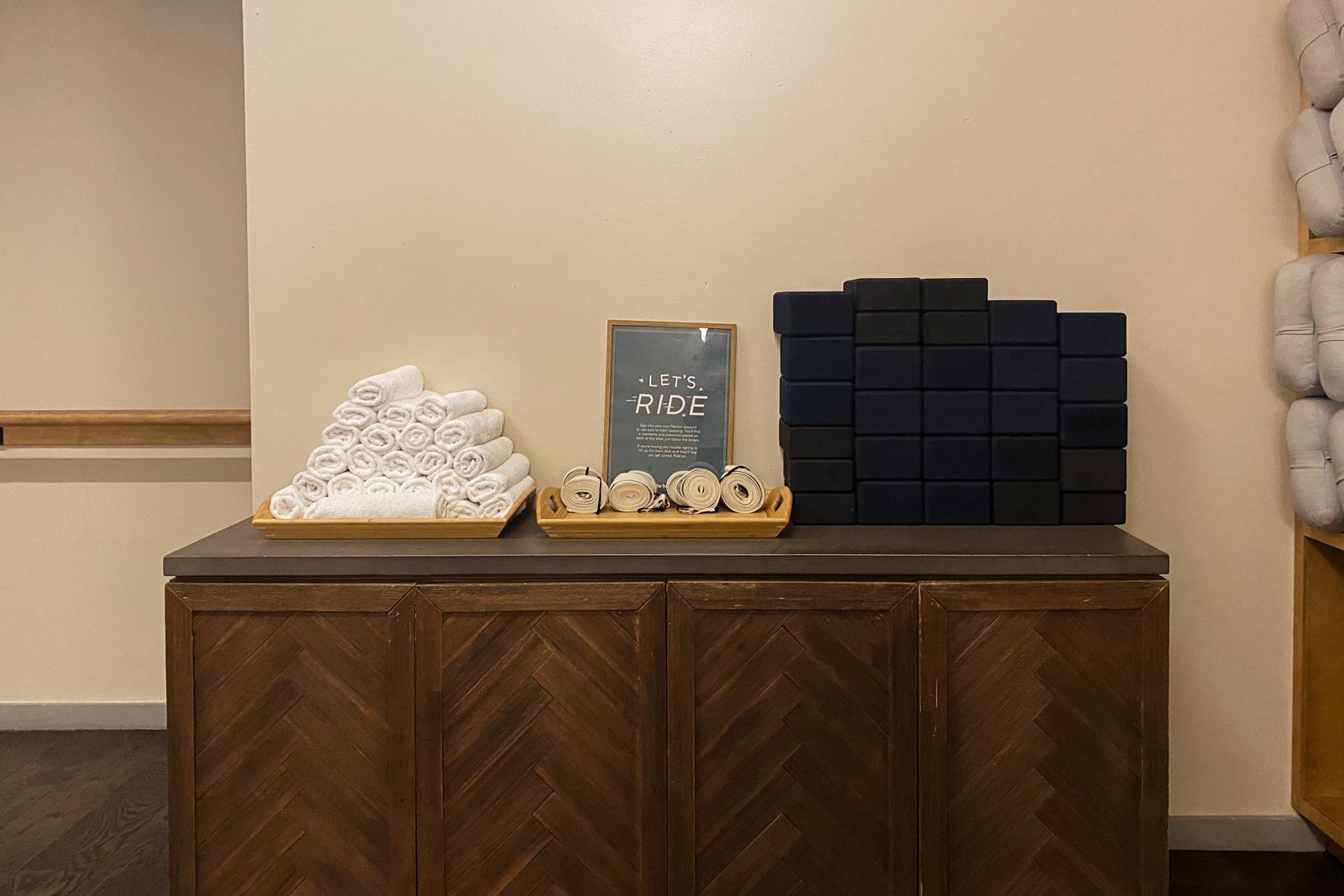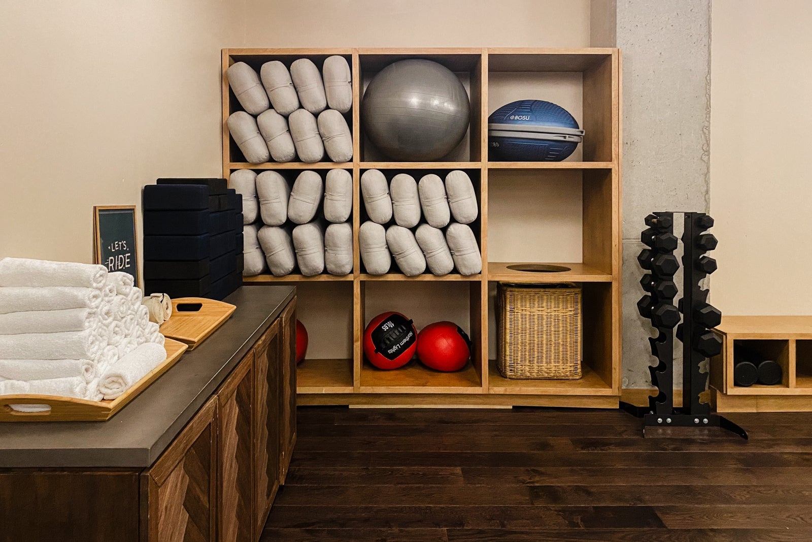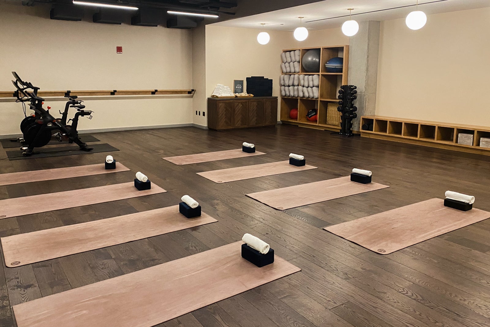 Next to Lazy Bird is a one-room, fairly bare-bones gym set up as a yoga studio with 12 yoga mats and blocks. Though you may find the space limiting, you can do your own workout with two Peloton bikes and free weights. This space is open 24/7, and I was the only one there when I went.