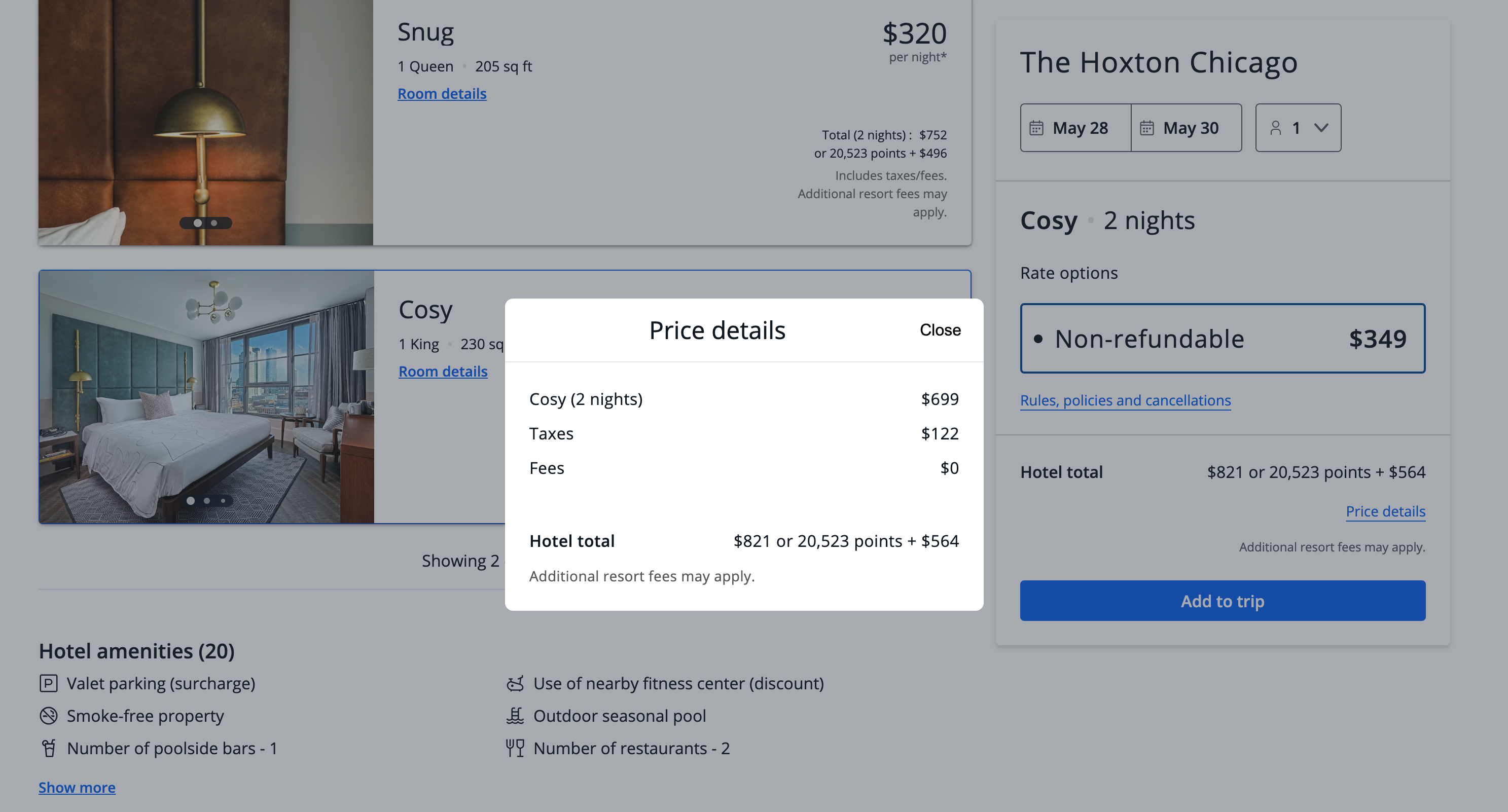 For the dates of my stay, a Cosy room cost $821, or 20,523 Ultimate Rewards points plus $564. Holders of the Chase Sapphire Preferred® Card who book hotels through the portal also get a $50 credit. Plus, the Sapphire Preferred earns 5 points per dollar spent on travel purchased through Chase Travel and 2 points per dollar spent on other travel.