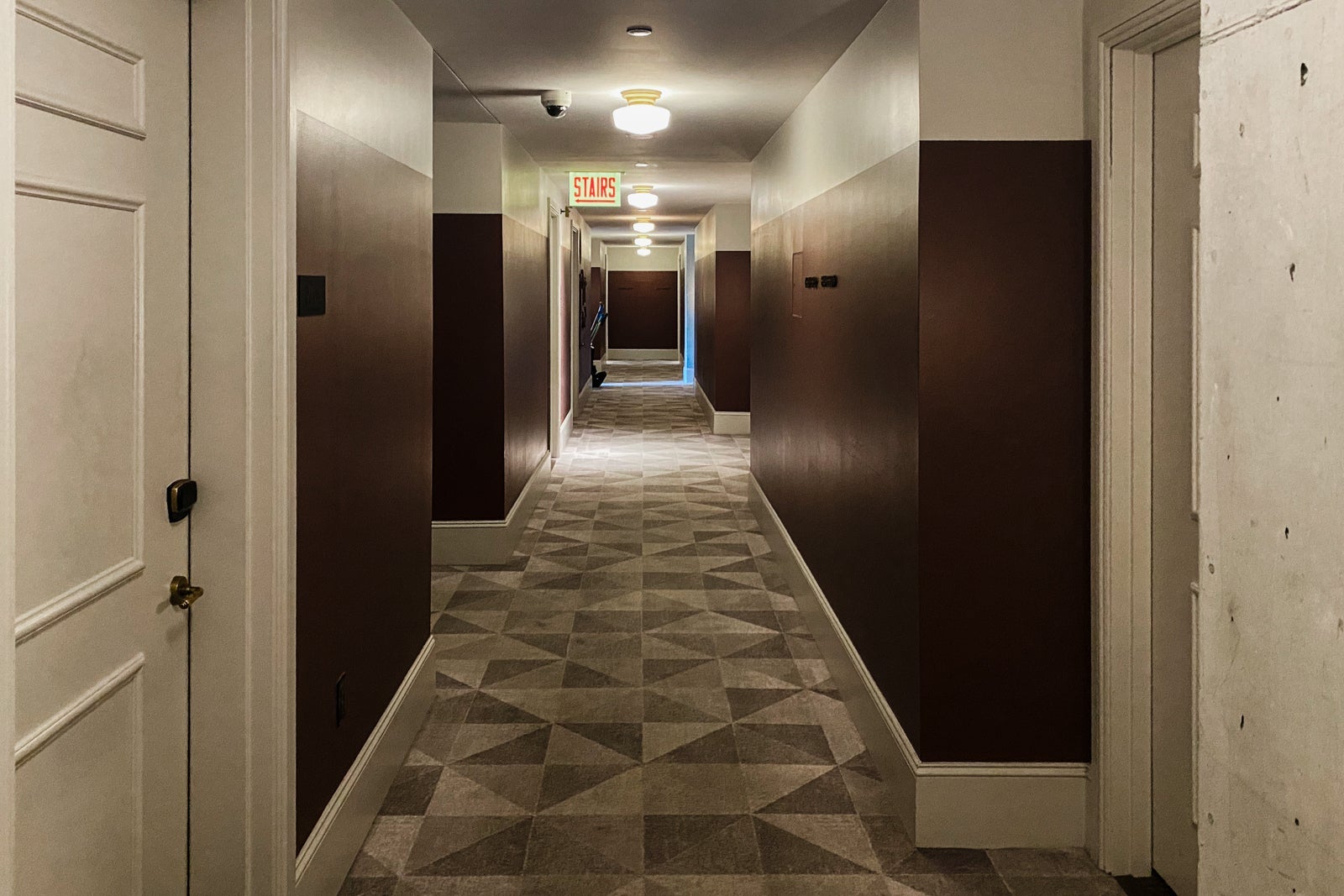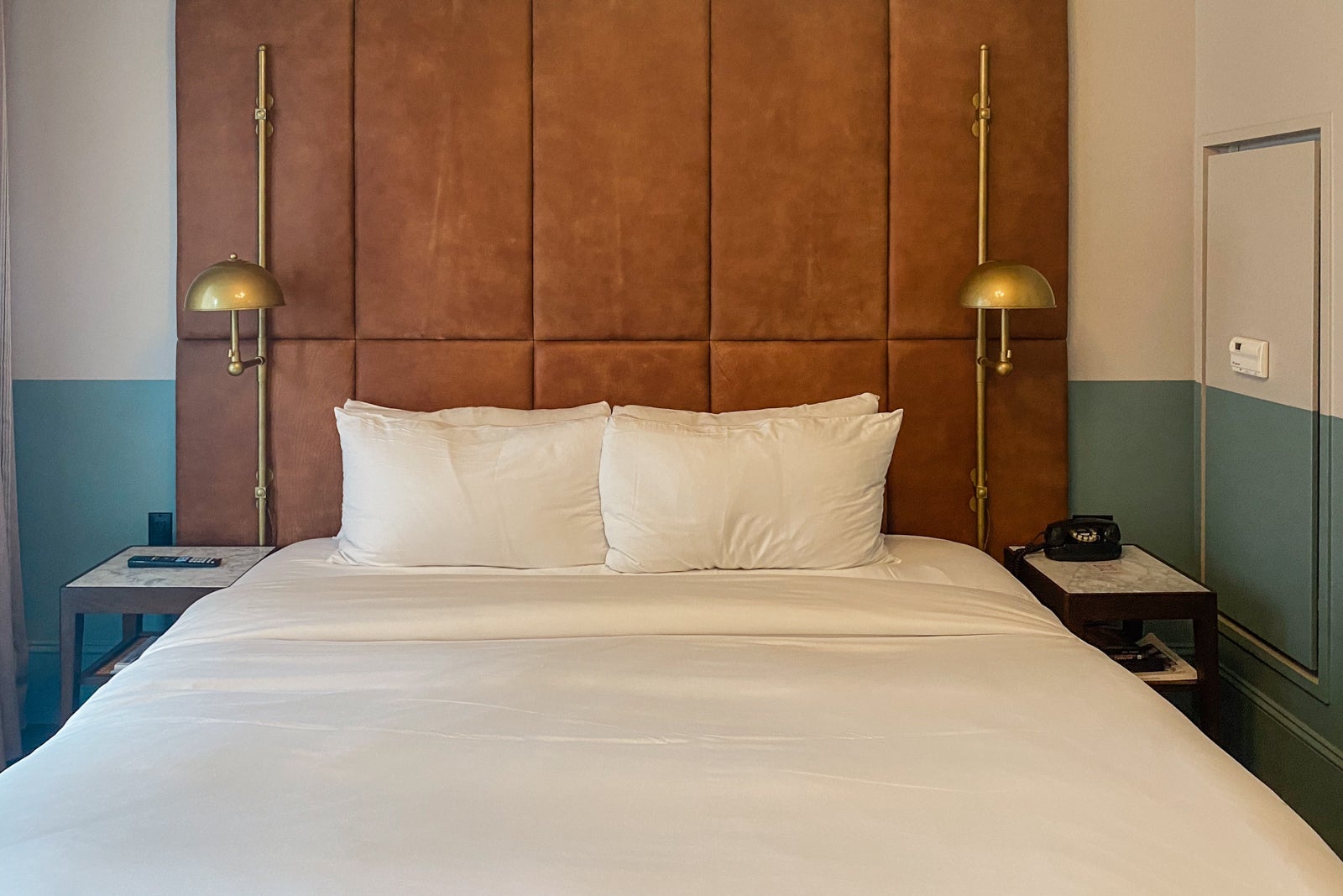 In each room, there are paneled leather headboards, midcentury furniture, concrete ceilings and bedding by Chicago artist Cody Hudson, with art curated by local gallery Johalla Projects.