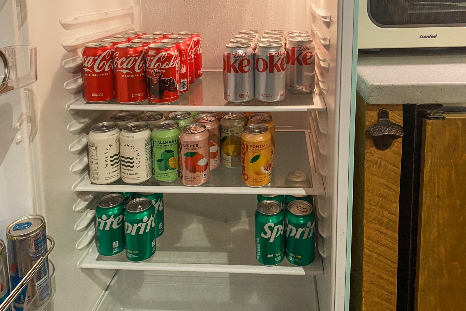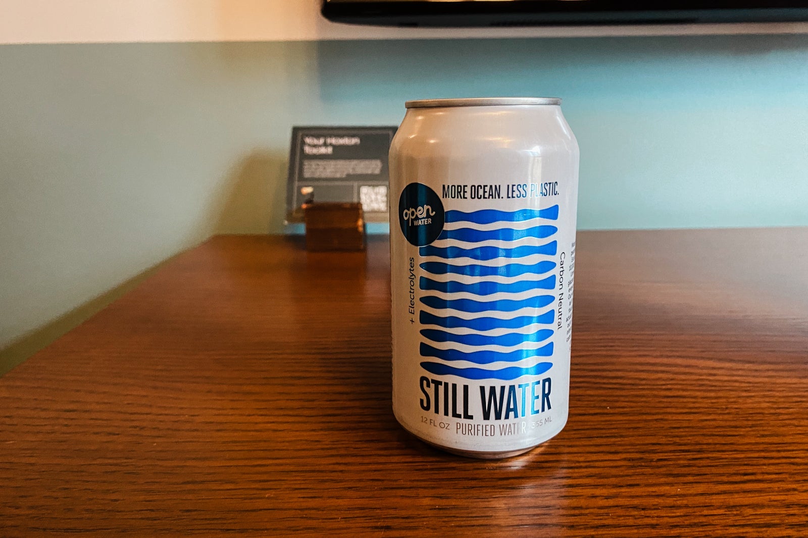 There was a small fridge (no freezer, which I typically seek for my ice roller) with complimentary canned water and a coffee maker with coffee pods and tea packets.