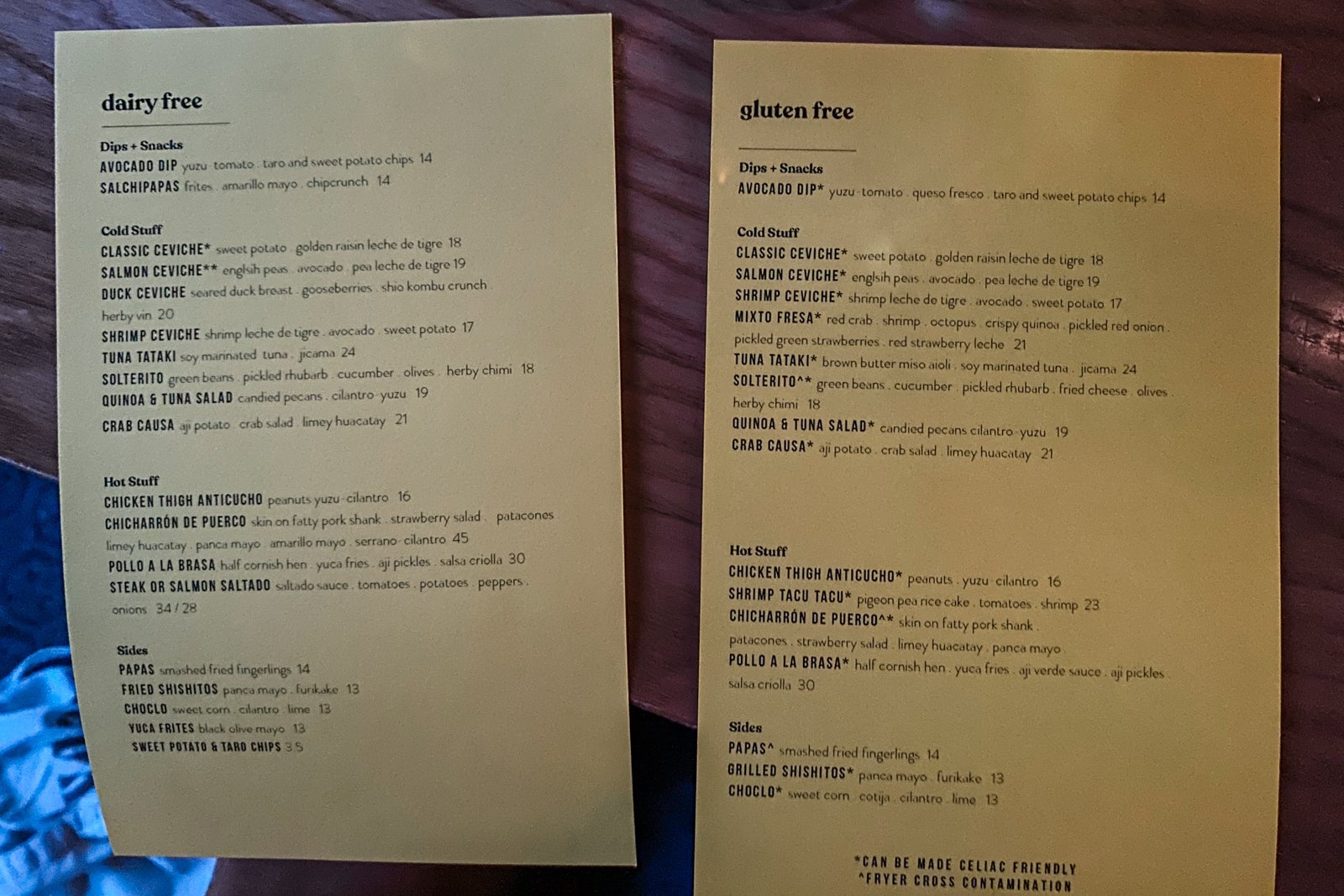Upon informing our waiter of my gluten- and dairy-free diet, he provided two separate menus reflecting both modifications and further described which dishes could be modified to suit both. At the staff's advice, my friend ordered a Pisco Sour (pisco, lime, egg white, $17), and we started with a variety of tapas, specifically the classic ceviche ($18), quinoa tuna salad ($19) and hot chorizo queso dip. For our main, we had the pollo a la brasa with an extra side of yuca fries ($30).