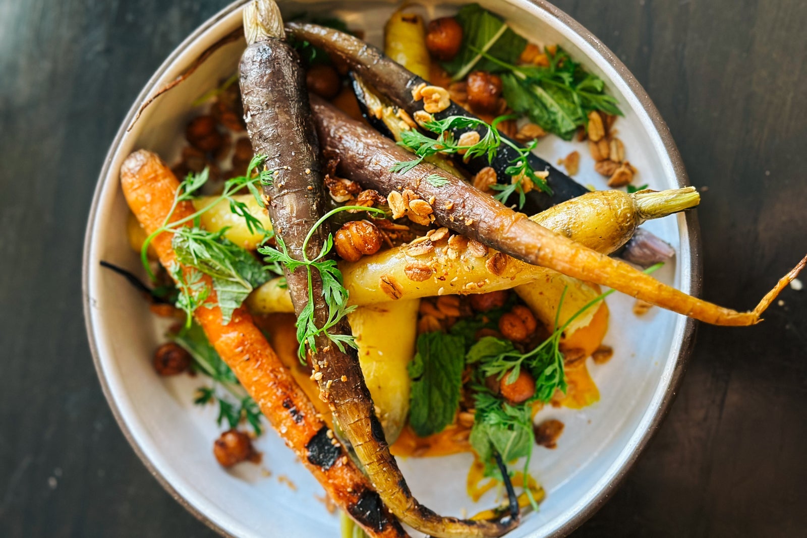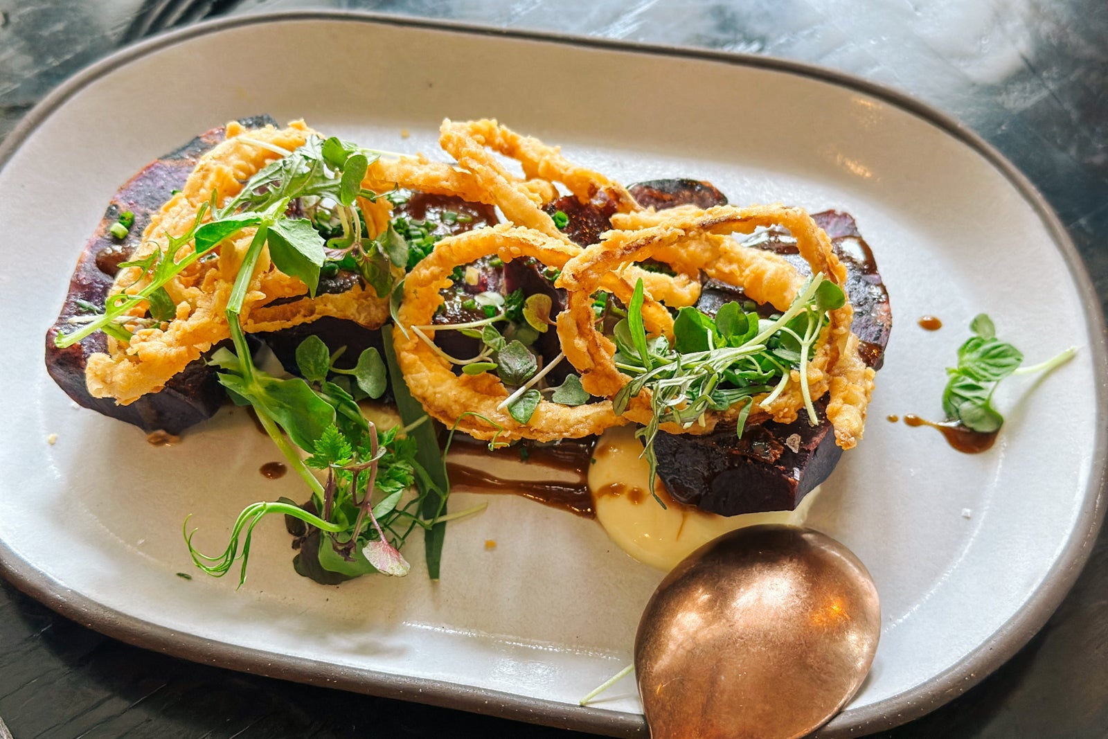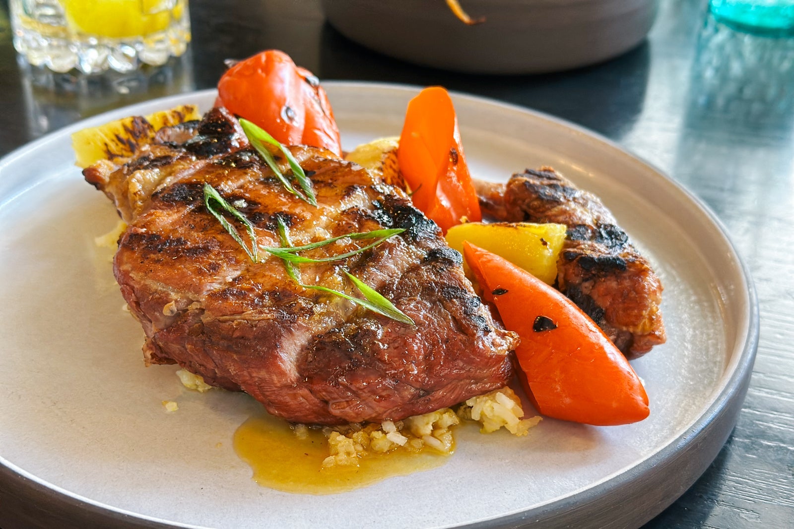 Dinner was a prettily plated procession of memorable flavors, including scallops with roasted maitake, yuzu kosho and pickled mushrooms ($55) that my husband deemed the best he'd ever had; fabulously hickory-smoked Okinawan sweet potatoes with black garlic vinaigrette, yuzu aioli and crispy shallots ($14); and my juicy sweet-and-sour pork chop with garlic rice, pineapple and sweet peppers ($54). The generous portions somehow seemed true to the age and history of the place. This ranch fare with a surprising twist was courtesy of the opening Filipino chef, Rhoda Magbitang; however, a new chef, Auberge alum Joe Humphrey (most recently at Hotel Jerome), had just started but not yet revealed his new menu.