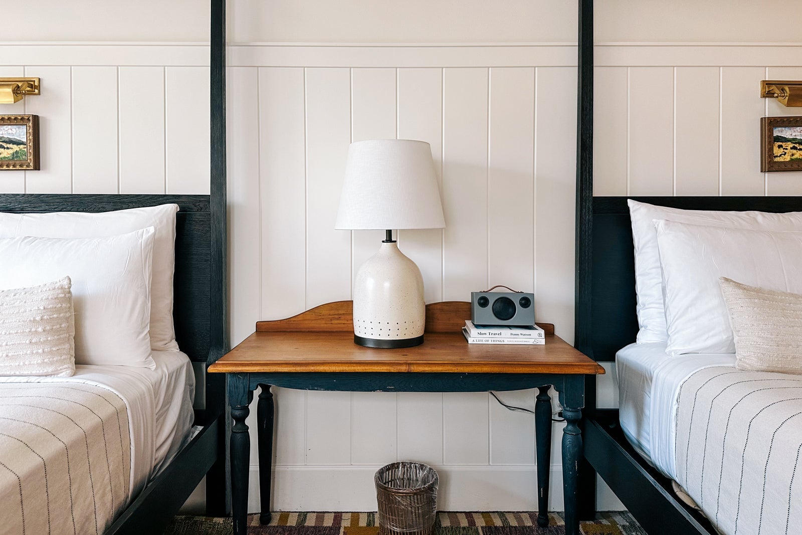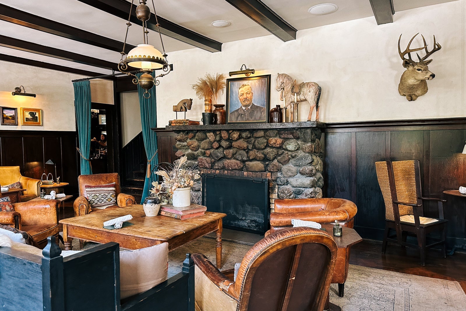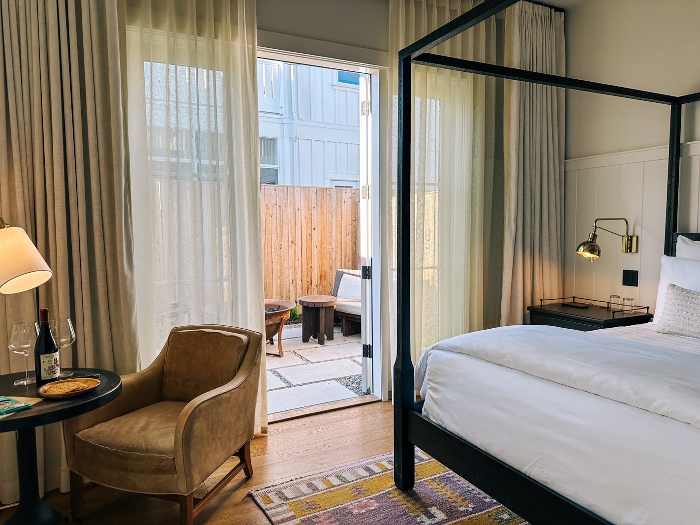 My first impression stepping into the high-ceilinged room was that it felt crisp but also cozy, with woven textiles and four-poster beds, petite landscape paintings, wainscoting, exposed beams and woolen rugs. All rooms have a place to sit out in the fresh air — such as a terrace, patio or porch swing — as well as some fire element, whether a fire pit or fireplace, the mantels of which are made from rustic railroad ties from the original train tracks aside the hotel.