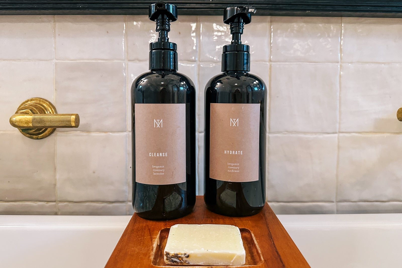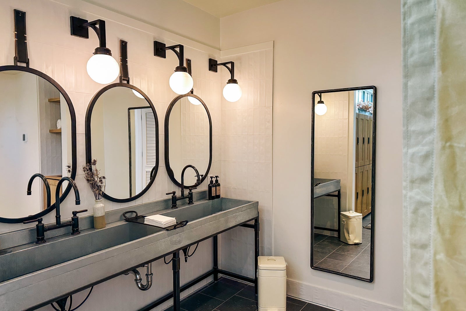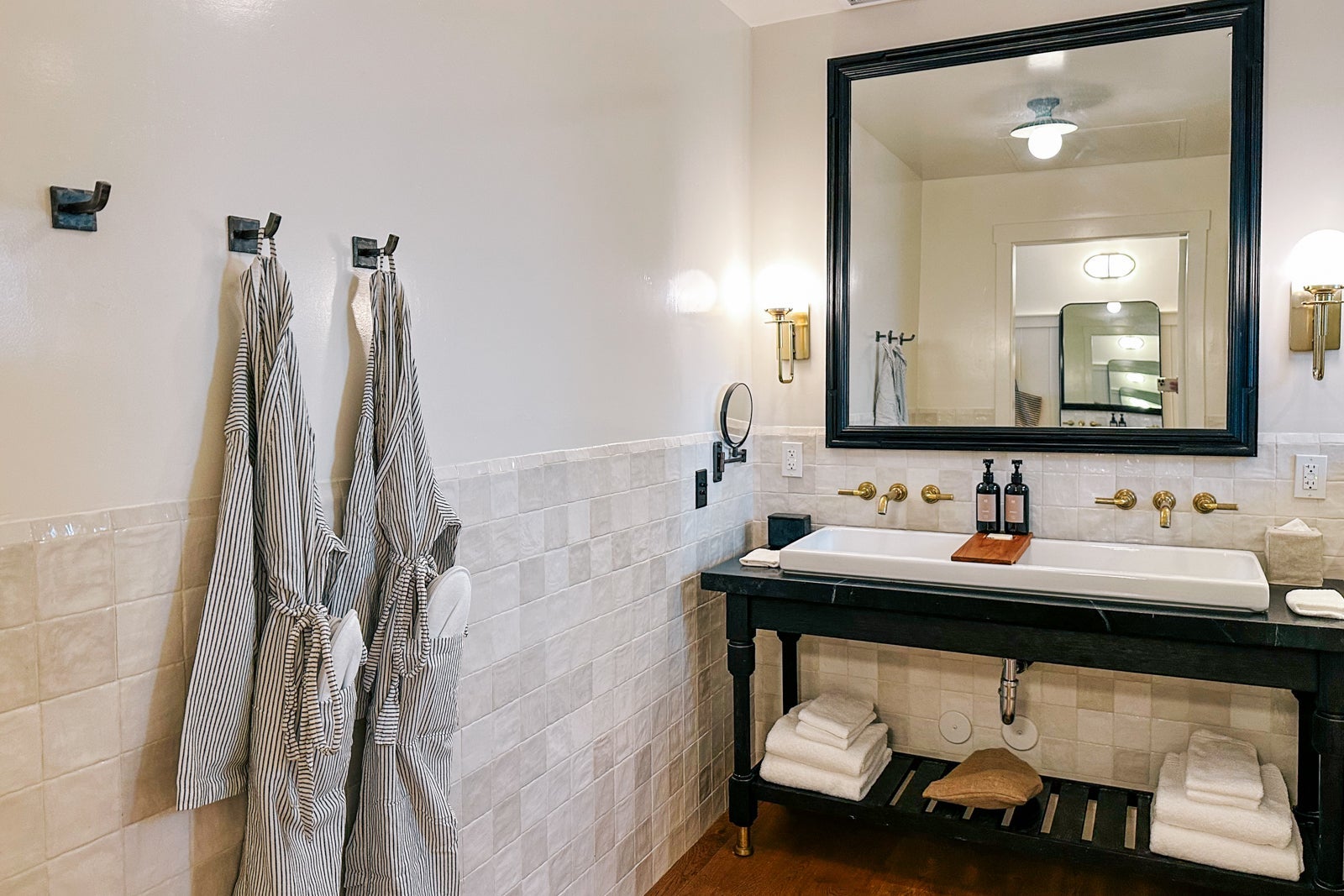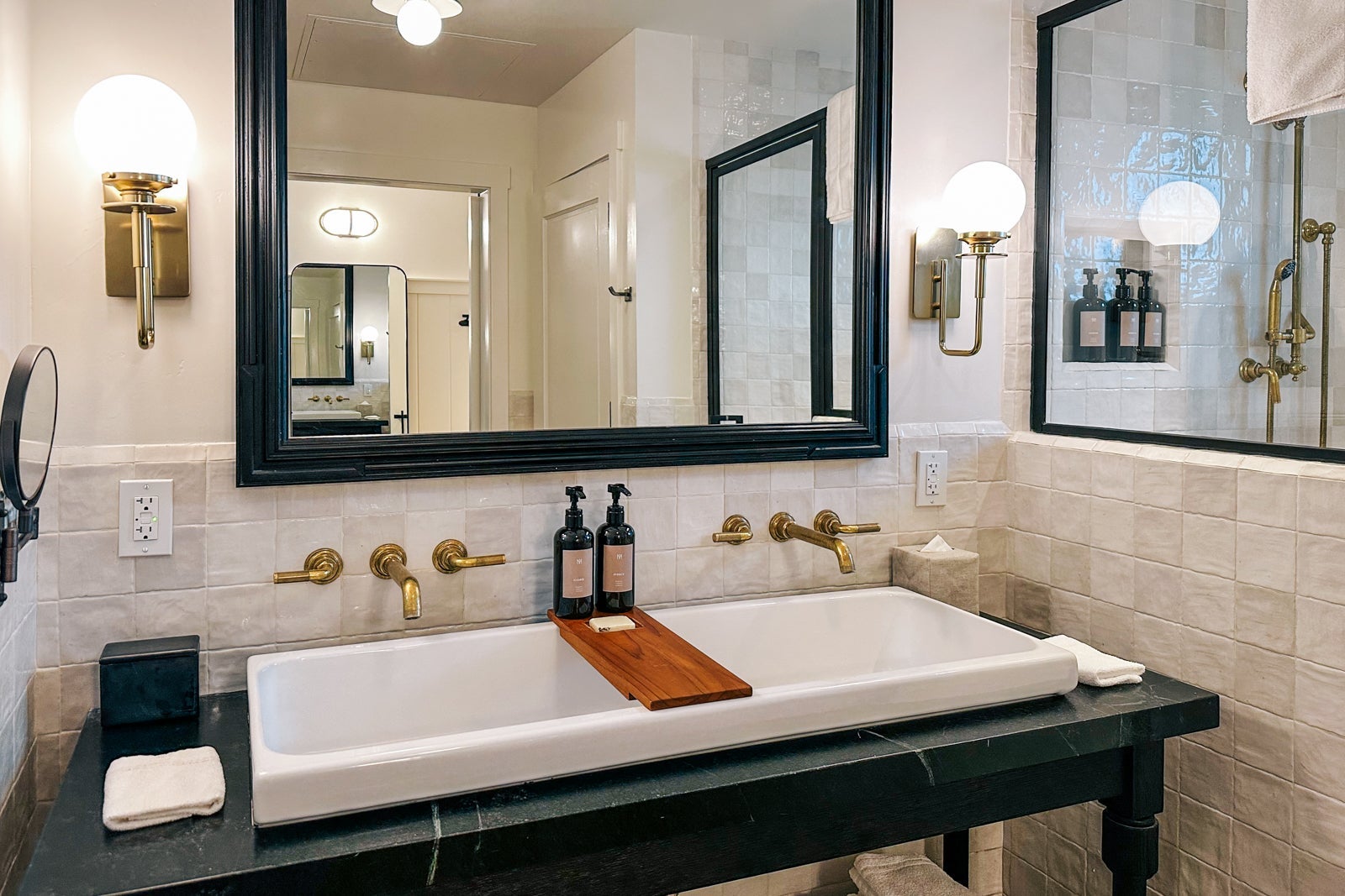 The lovely tiled bathroom was unique with its long farmhouse sink and fantastic-smelling custom toiletries.