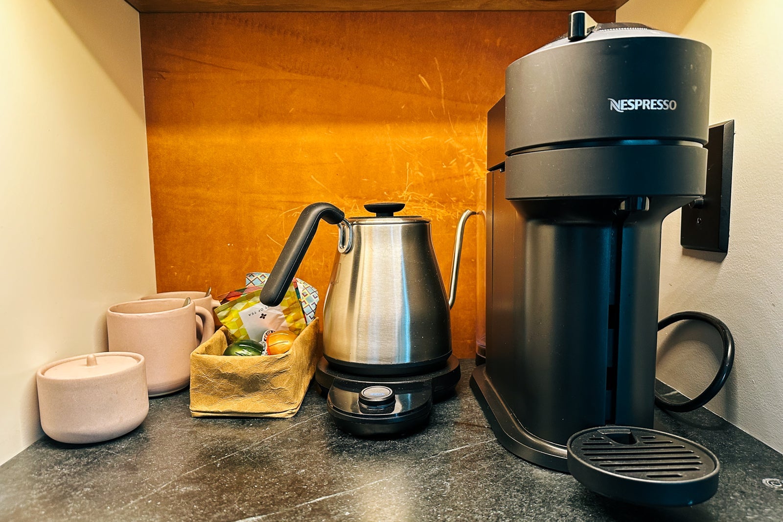 As I've come to expect at Auberge properties, there were plenty of thoughtful touches, such as an Audio Pro speaker, wireless phone charger, cool bathrobes, a cute tote bag and a Pendleton wool blanket with leather strap carrier for use during our stay. The latter felt like an invitation to cozy up outside on an Adirondack chair as the temperature dropped. The minibar shelves featured not only a tempting curation of savory and sweet snacks and libations but also coffee table books, interesting glassware and, of course, a Nespresso machine and electric kettle.