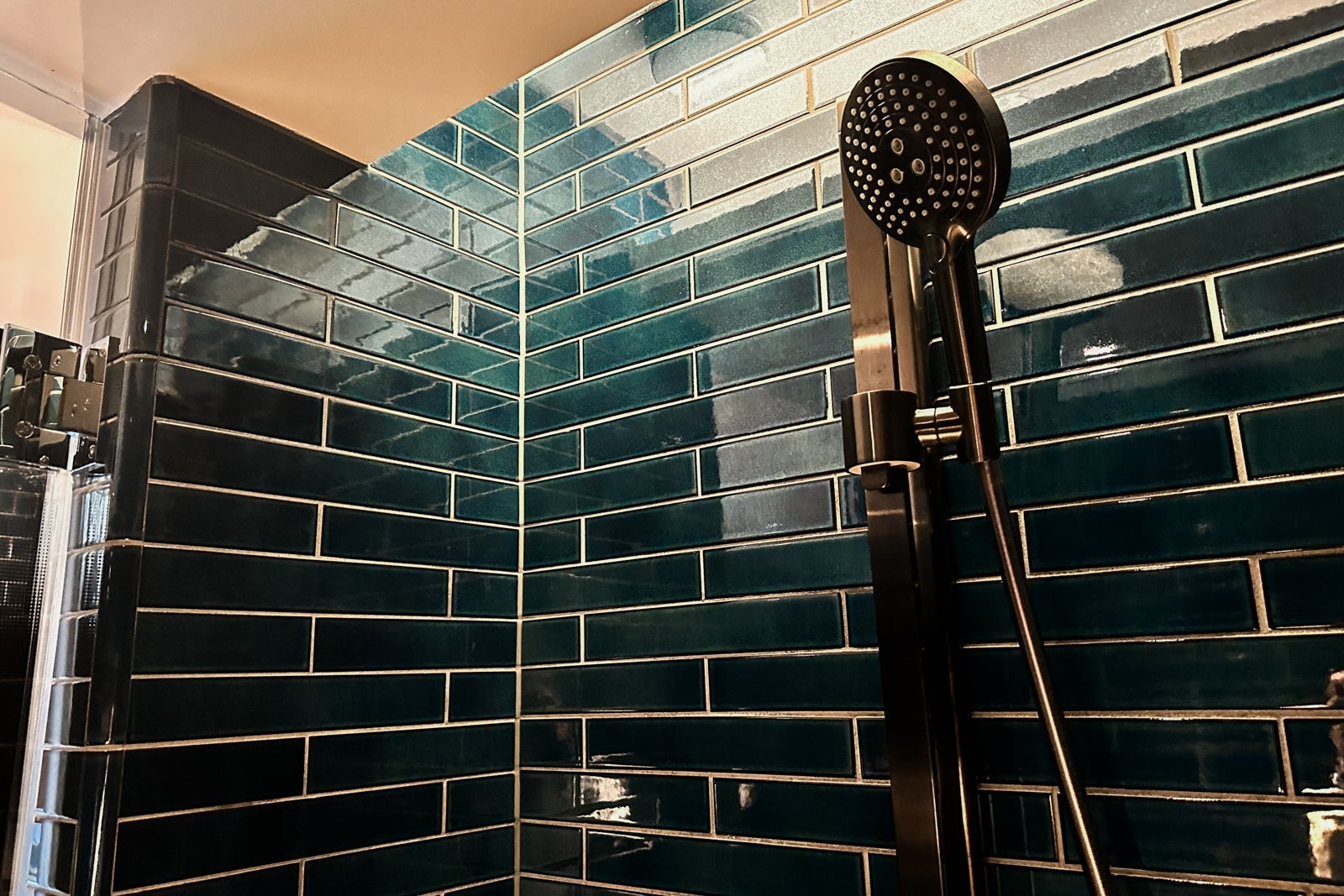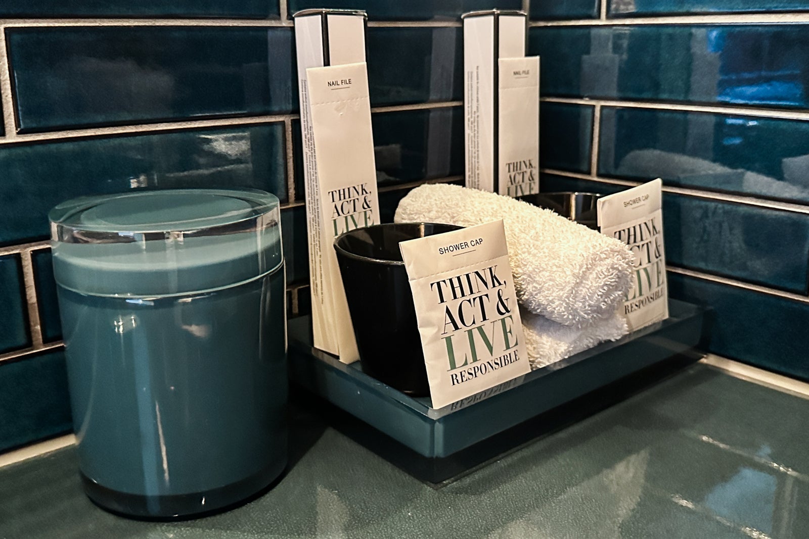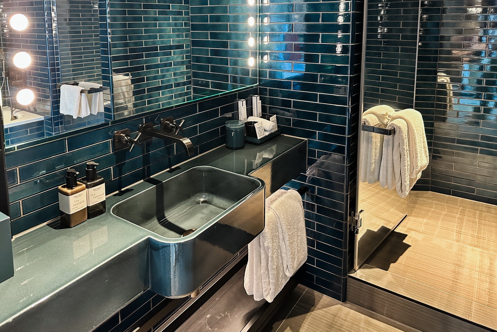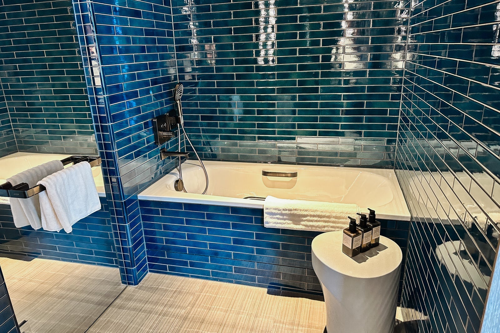 At the far end of the room was the bathroom decked out in head-to-toe subway tile that was a mix of deep greens and blues. I love a hotel bathtub, and this one looked like a deep soaking tub at first glance. However, I realized once I was inside trying to soak that it was actually on the shallower side.