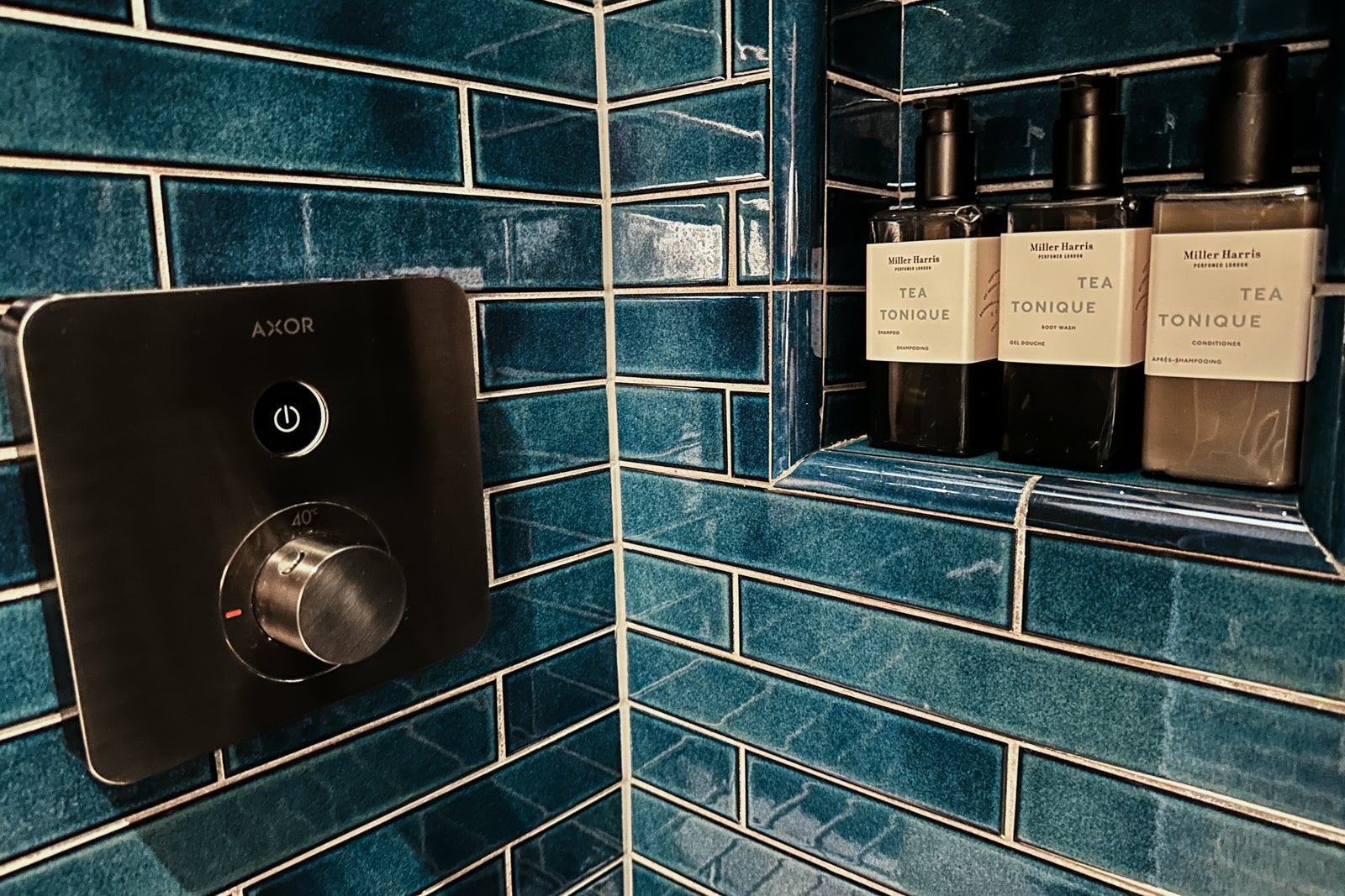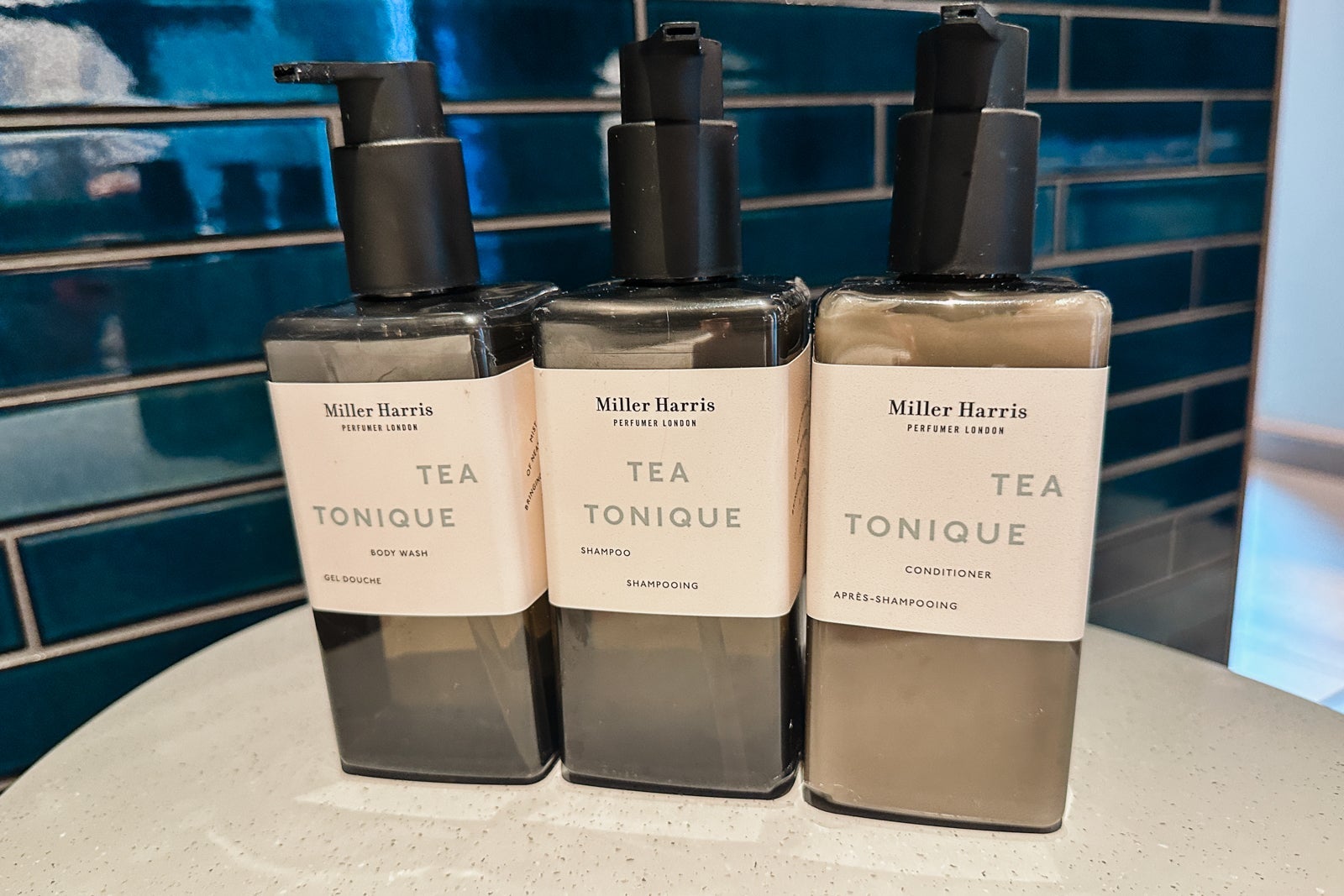 The rest of the bathroom consisted of an equally dramatic green sink with plenty of bathroom amenities (think: toothbrush kit, cotton swabs, nail file) and Miller Harris Tea Tonique soaps, shampoo, conditioner and lotion.