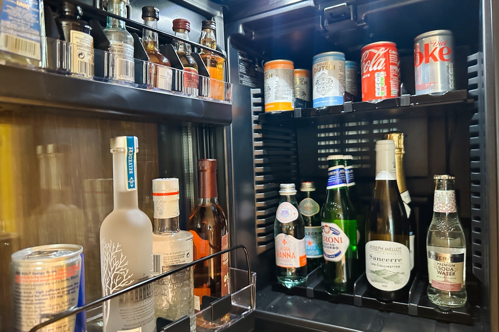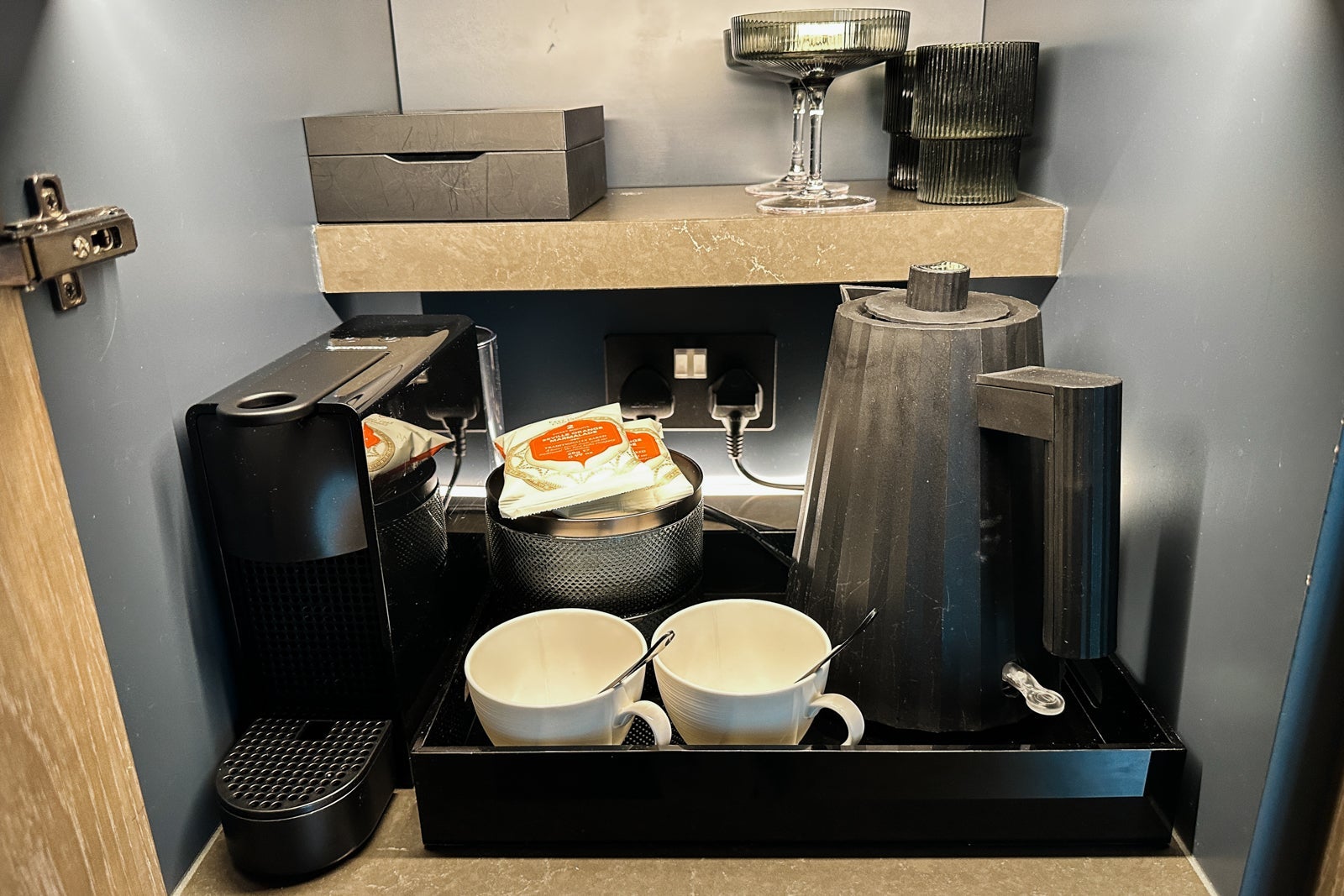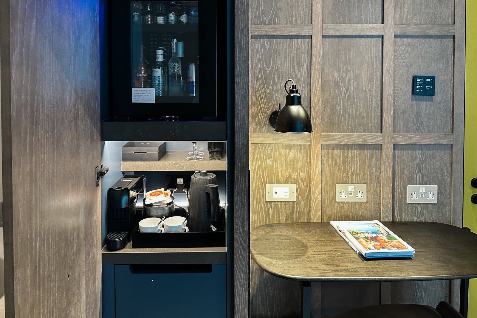 A minifridge and a tea and coffee area were hidden in a wooden closet next to the desk. Offerings included sodas, wines, beers, Nespresso pods and various teas.