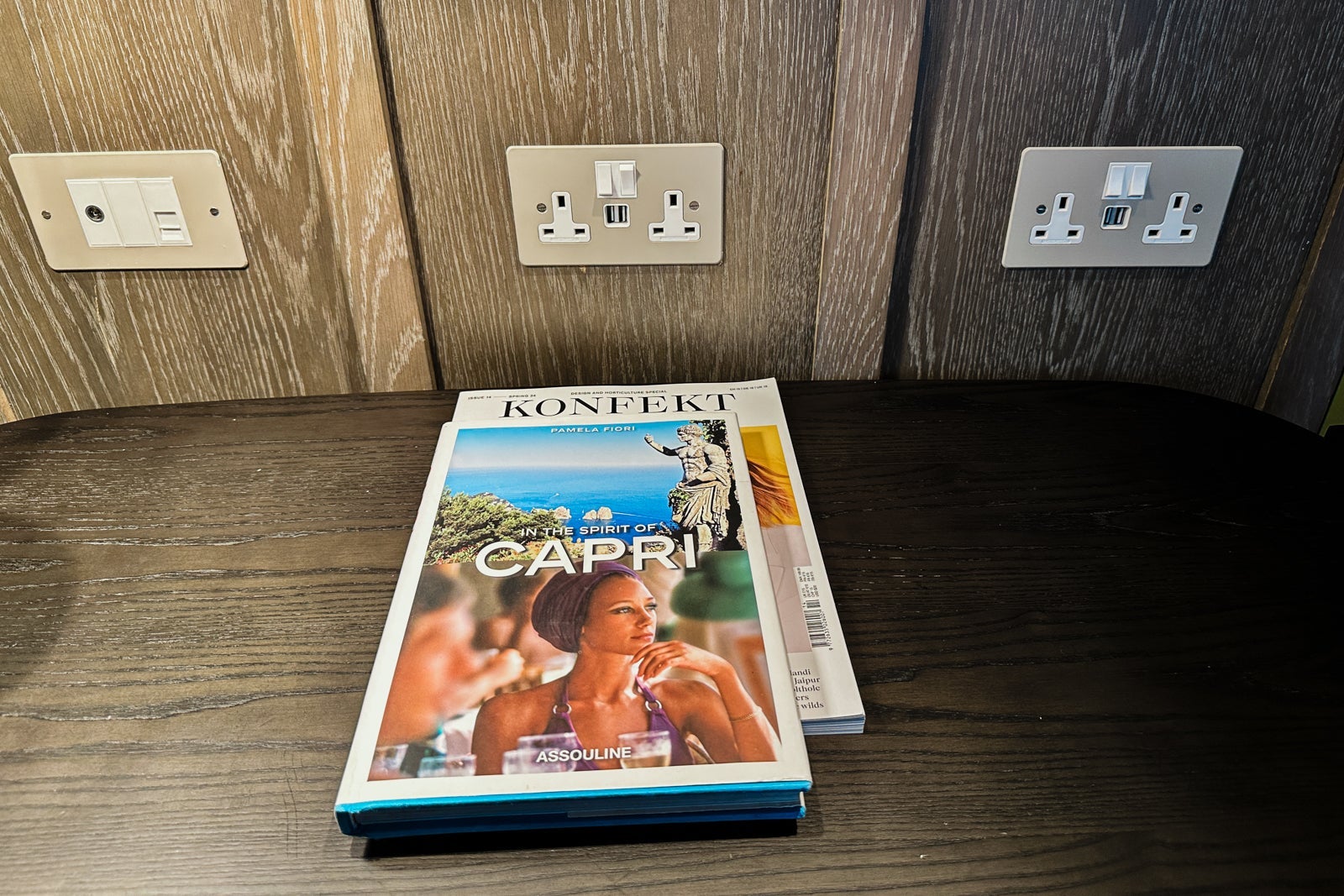 By the door was a small desk with multiple power outlets and USB plugs, plus a few travel magazines.