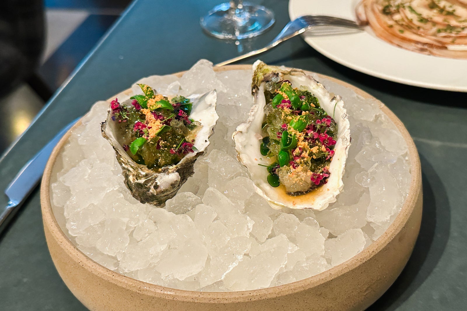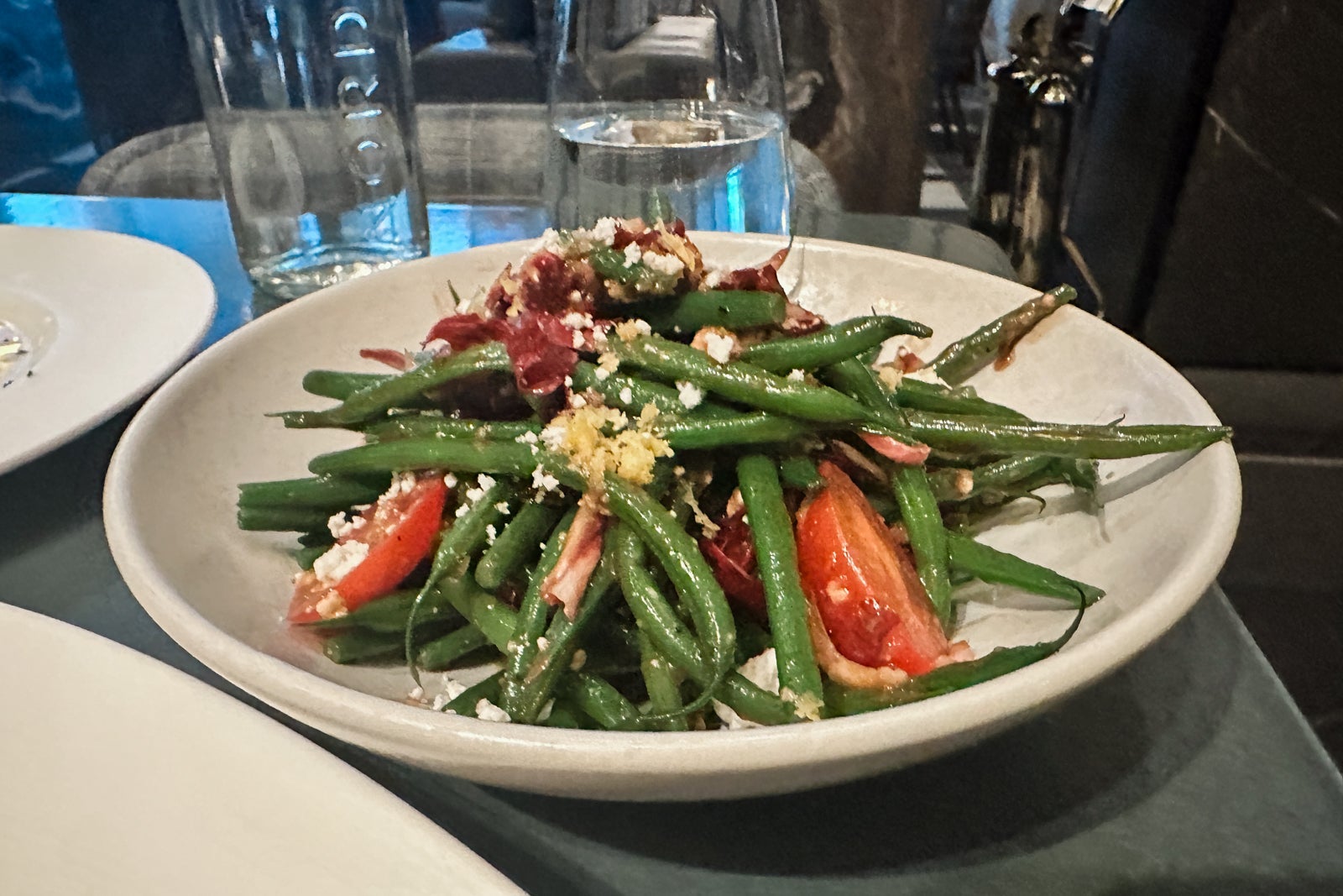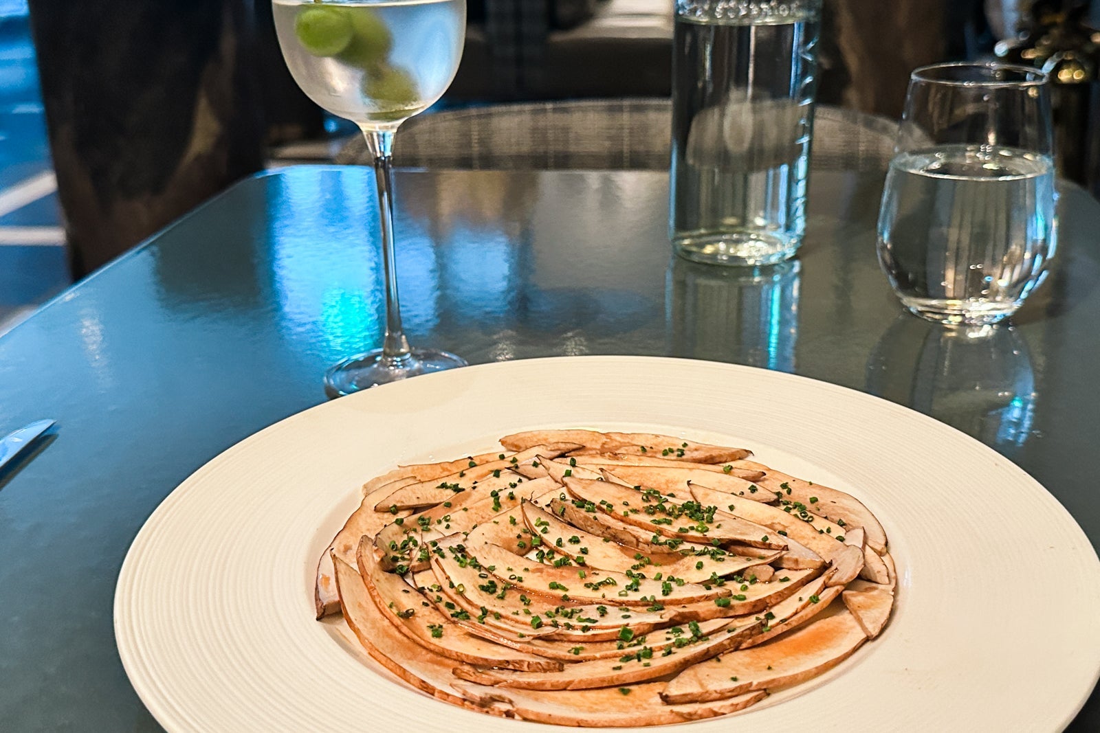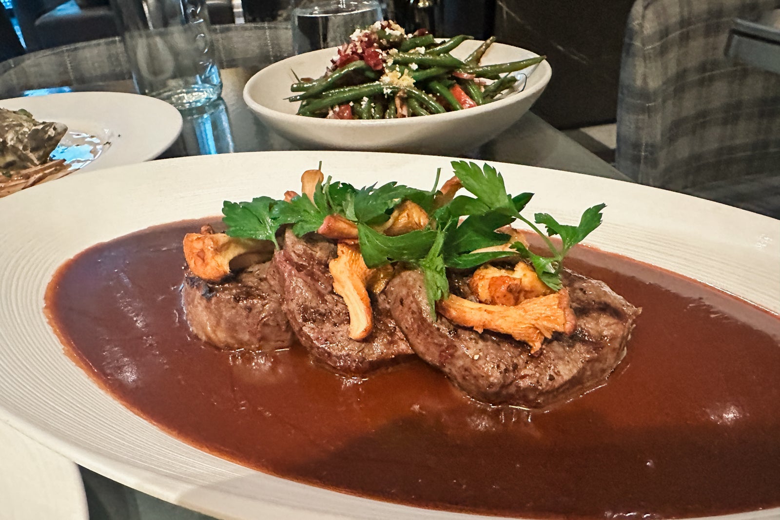 I ordered a fresh and light green bean salad with Datterino tomatoes and balsamic ($18); two Rock oysters ($18) that I found to taste overly dressed (with Veuve Clicquot and green Tabasco, which overpowered the oysters' delicate flavor); an expertly prepared filet mignon with chanterelle mushrooms and rich, delicious Parmesan creme ($54); and a side of delicately sliced portobello mushroom carpaccio with Dijon mustard and aged balsamic ($12).