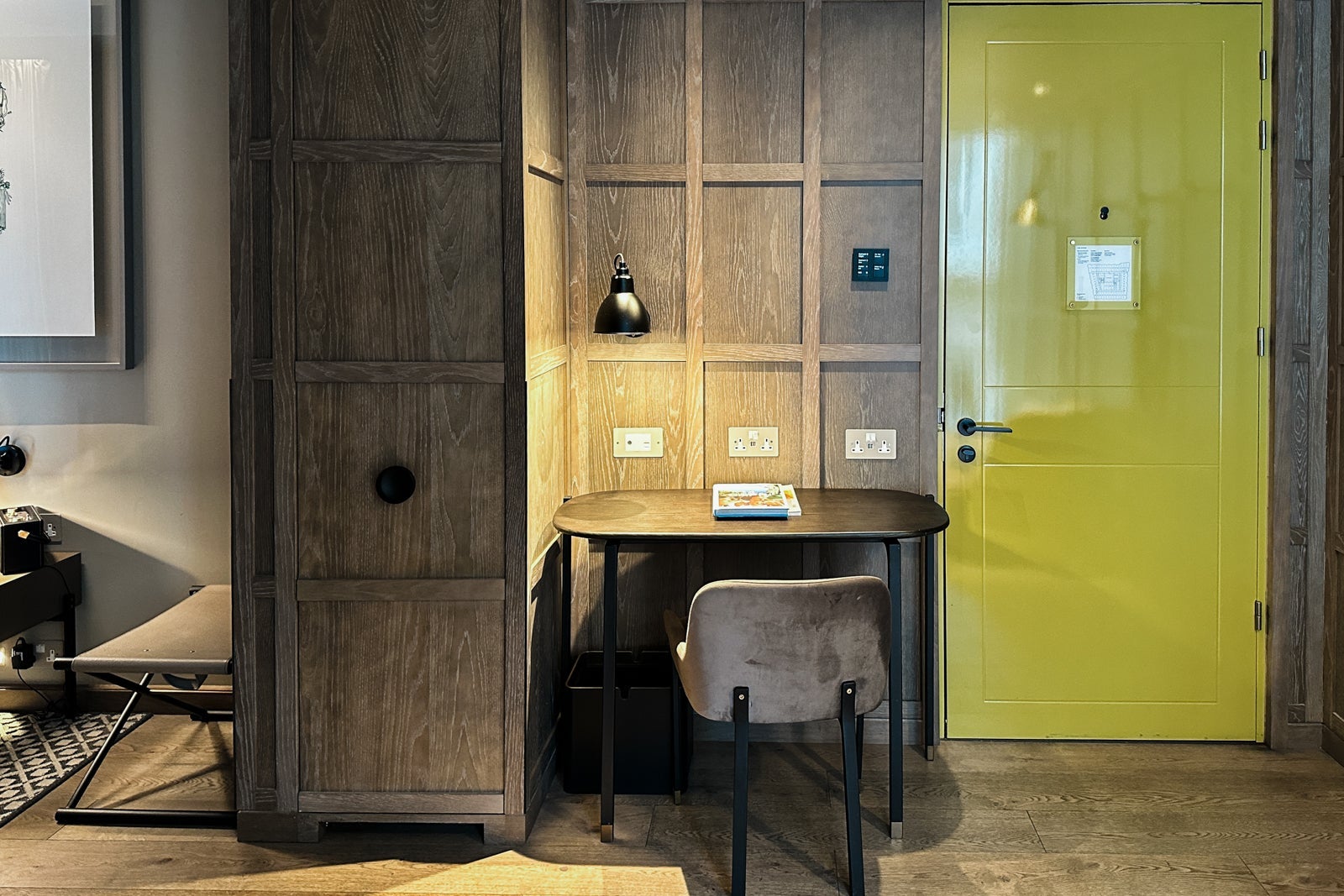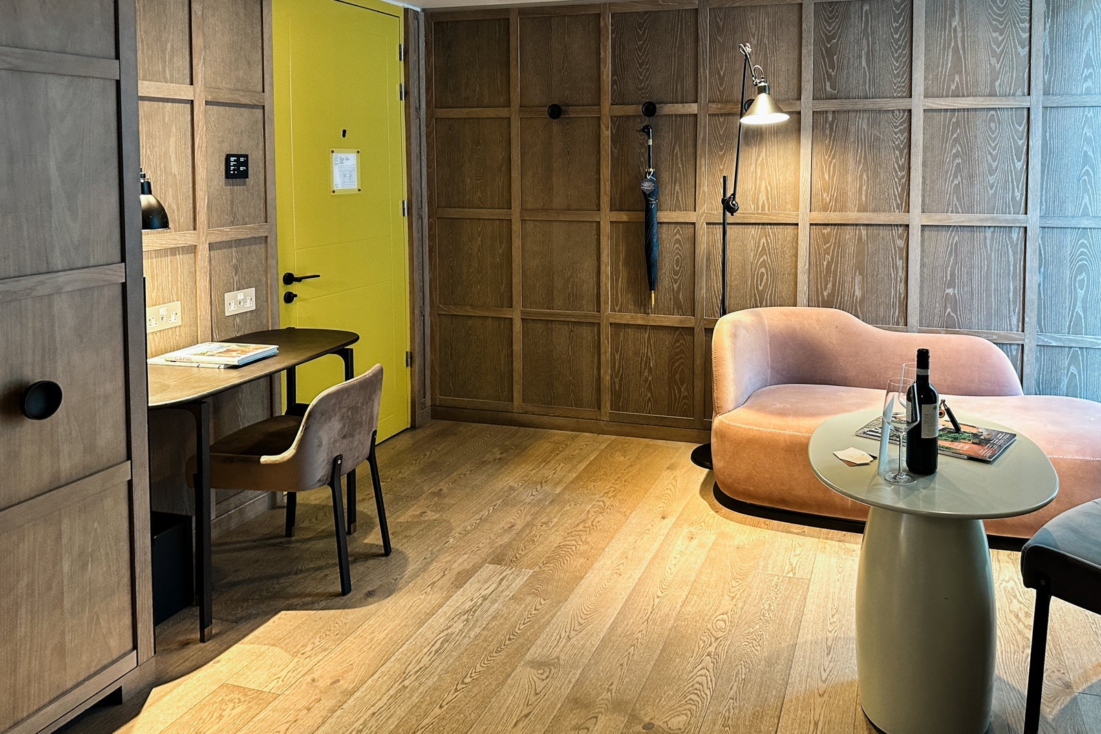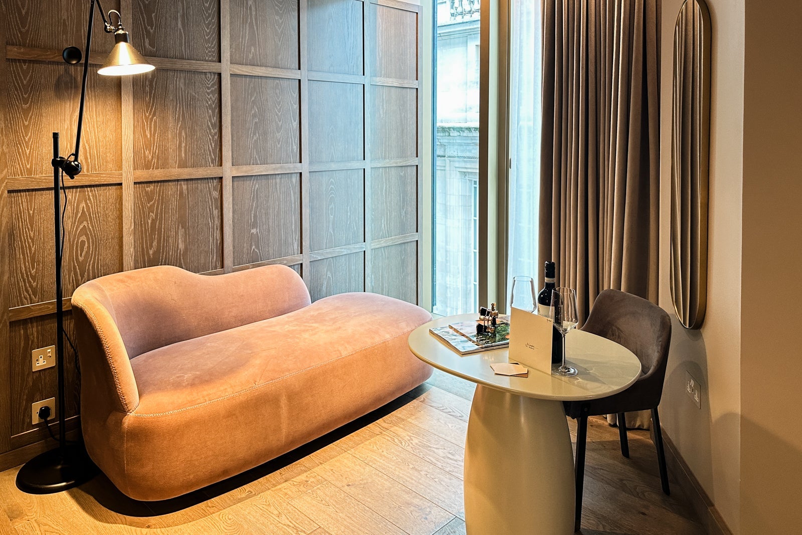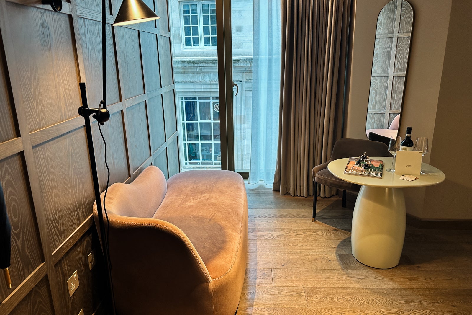 Inside the suite, I was greeted by a beautiful wooden wall with square paneling contrasting a lighter hardwood floor, a pink velvet modern fainting couch and an umbrella hanging from a peg by the door — convenient for rainy London days.
