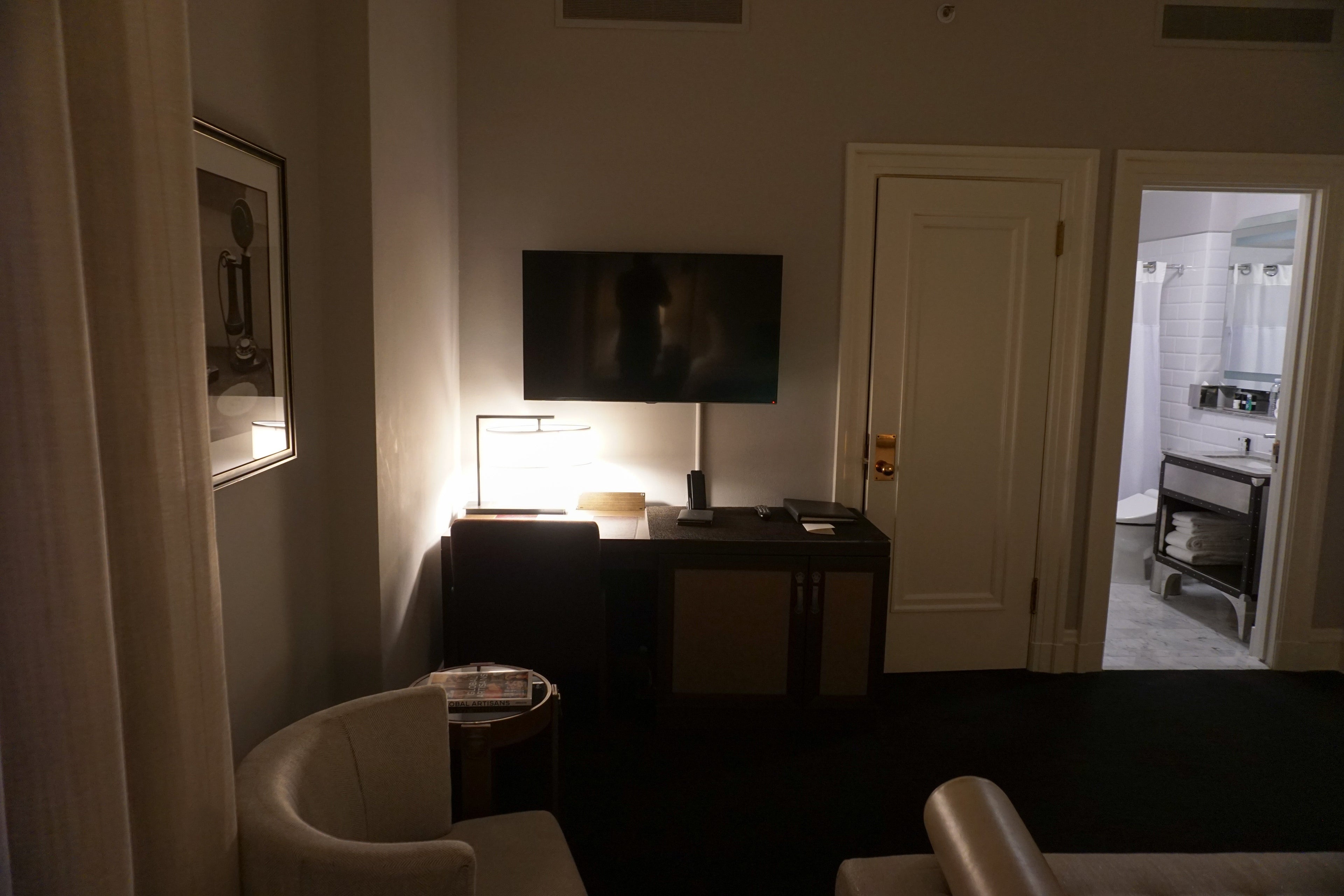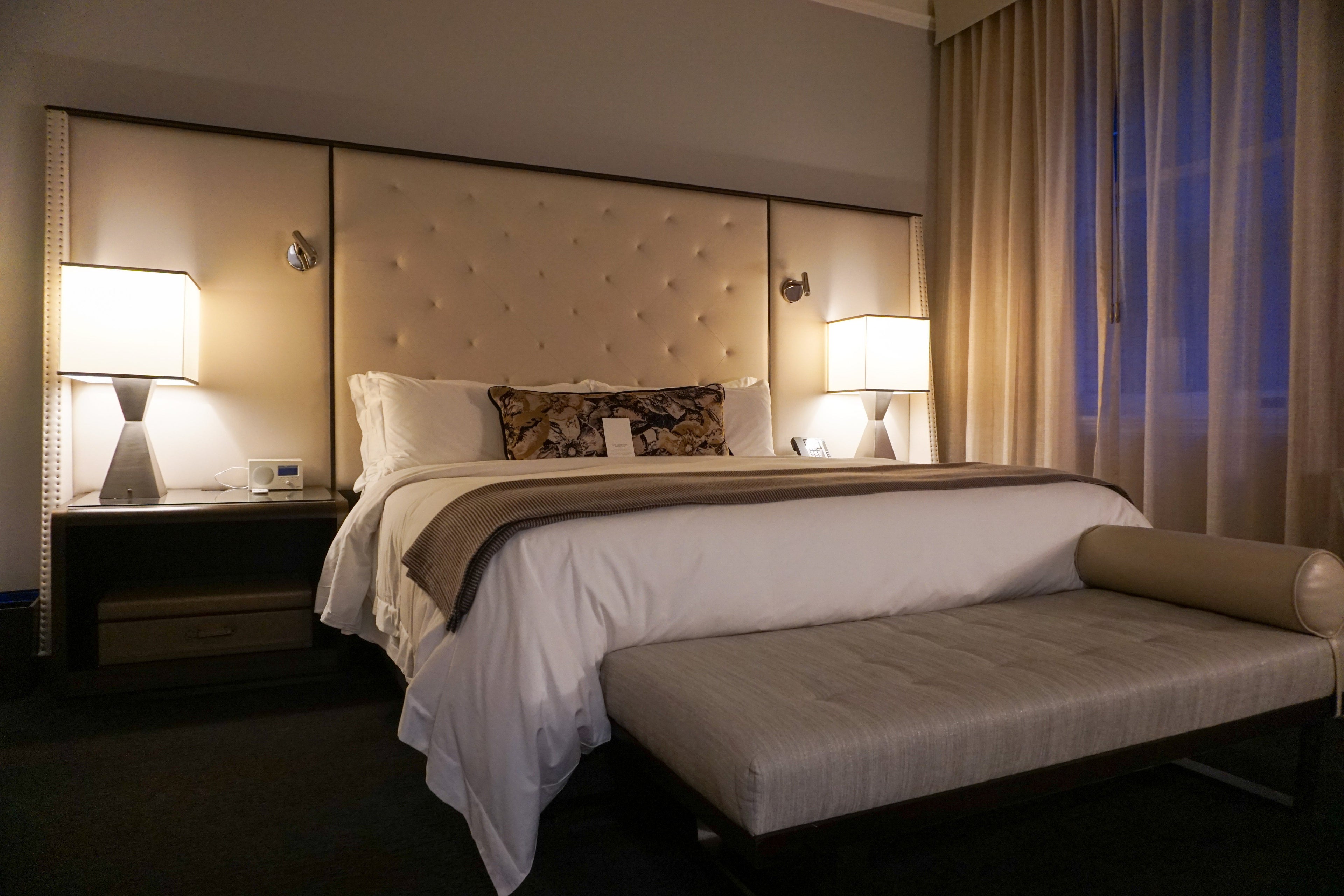 The room opened up to a massive king-size bed on the left. Plug ports were available on the lamps and there were plenty of lighting options by the bed, which I appreciated. The linens and throw on the bed were silky smooth and extremely comfortable.