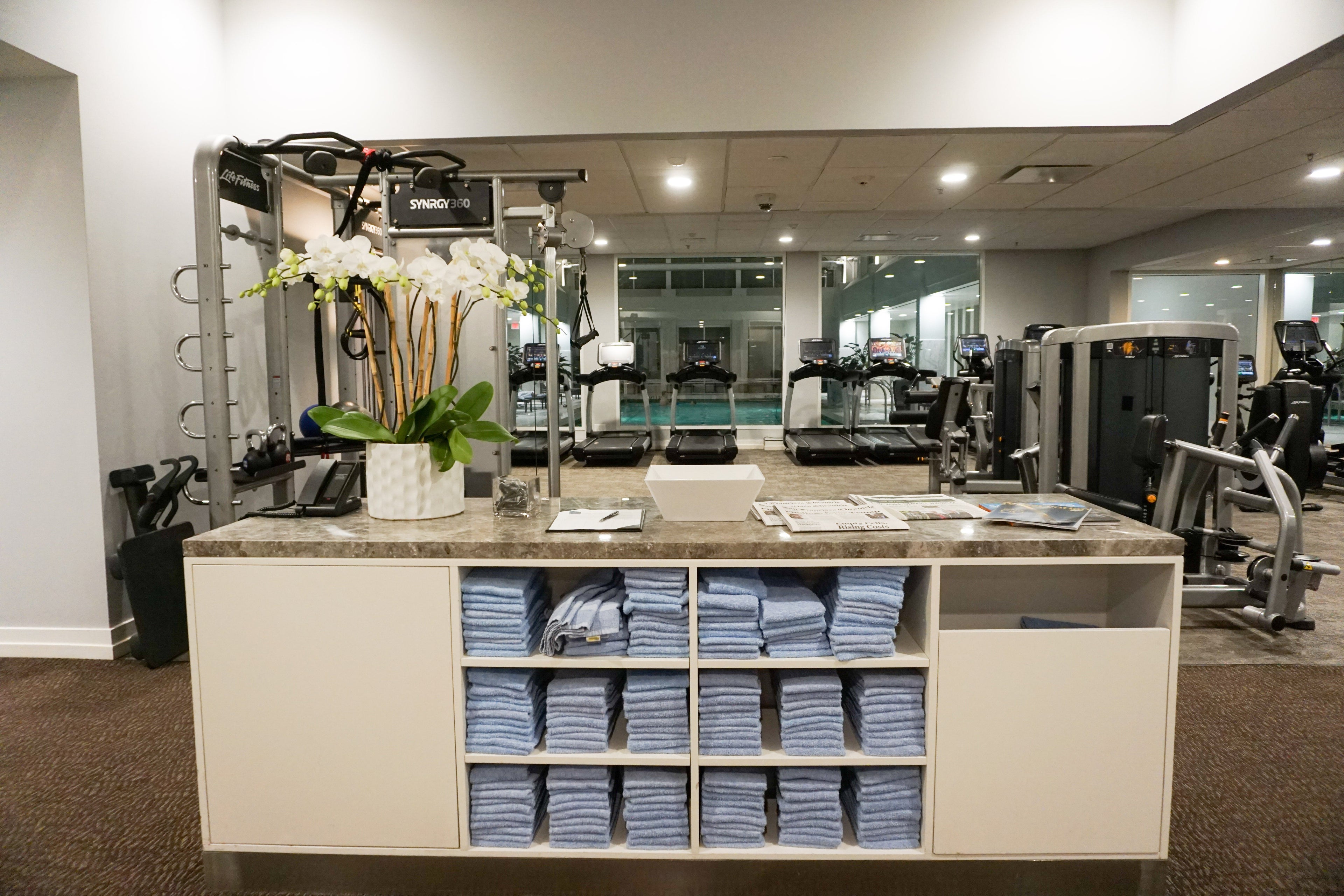 The Palace's gym and pool are on the same floor and are both sizable and well-equipped. The space had TRX bands, a pull-up bar, treadmills and plenty of natural light.