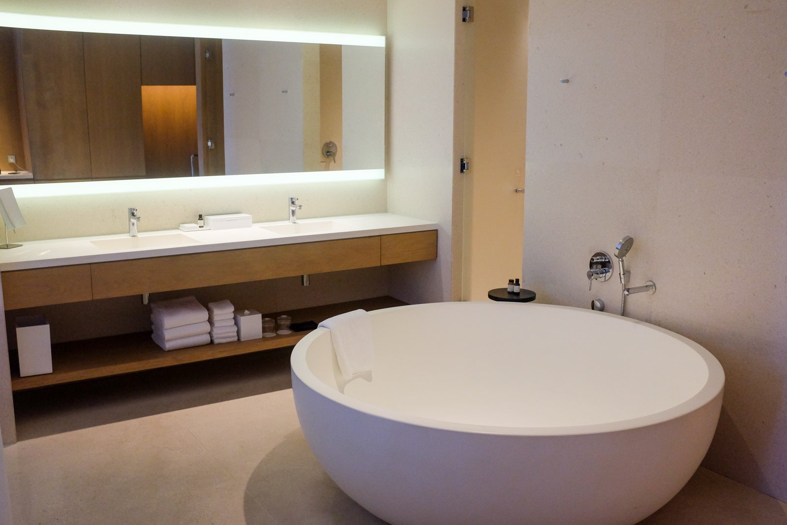 The bathroom was simply incredible. I loved the continued minimalist theme, with an elegant mirror lighting fixture and massive stone bathtub.