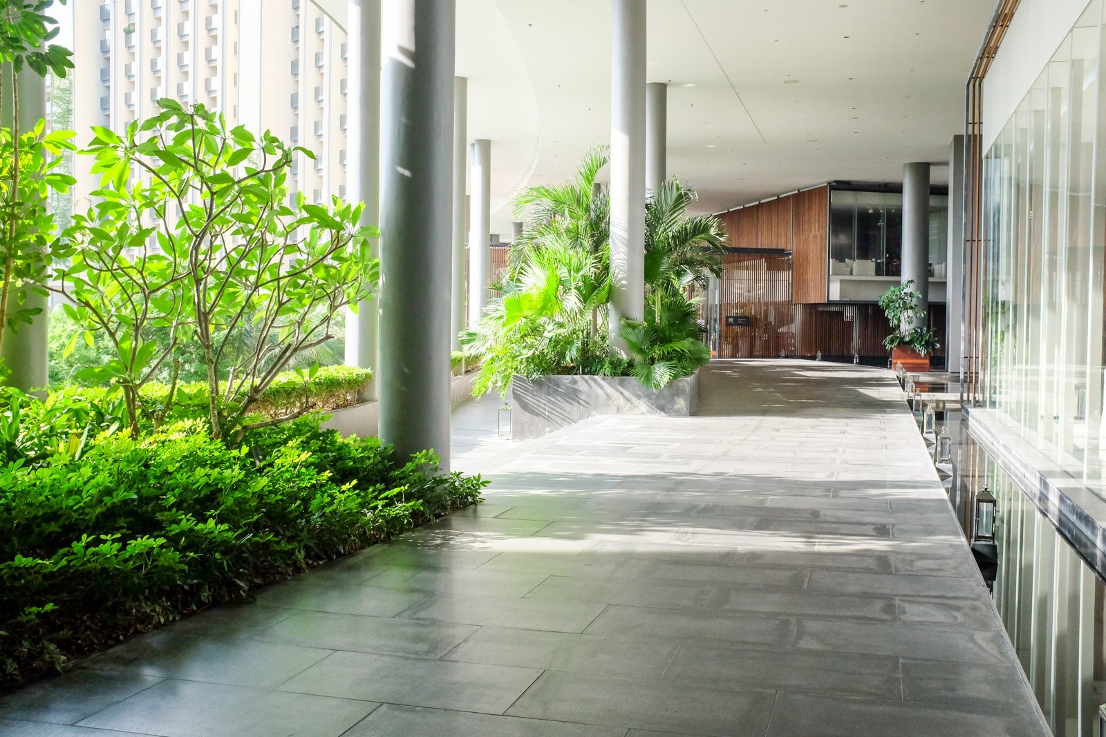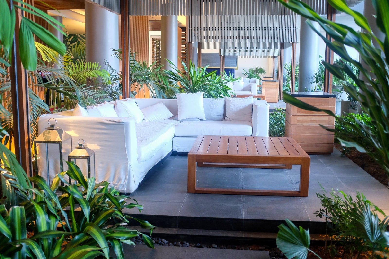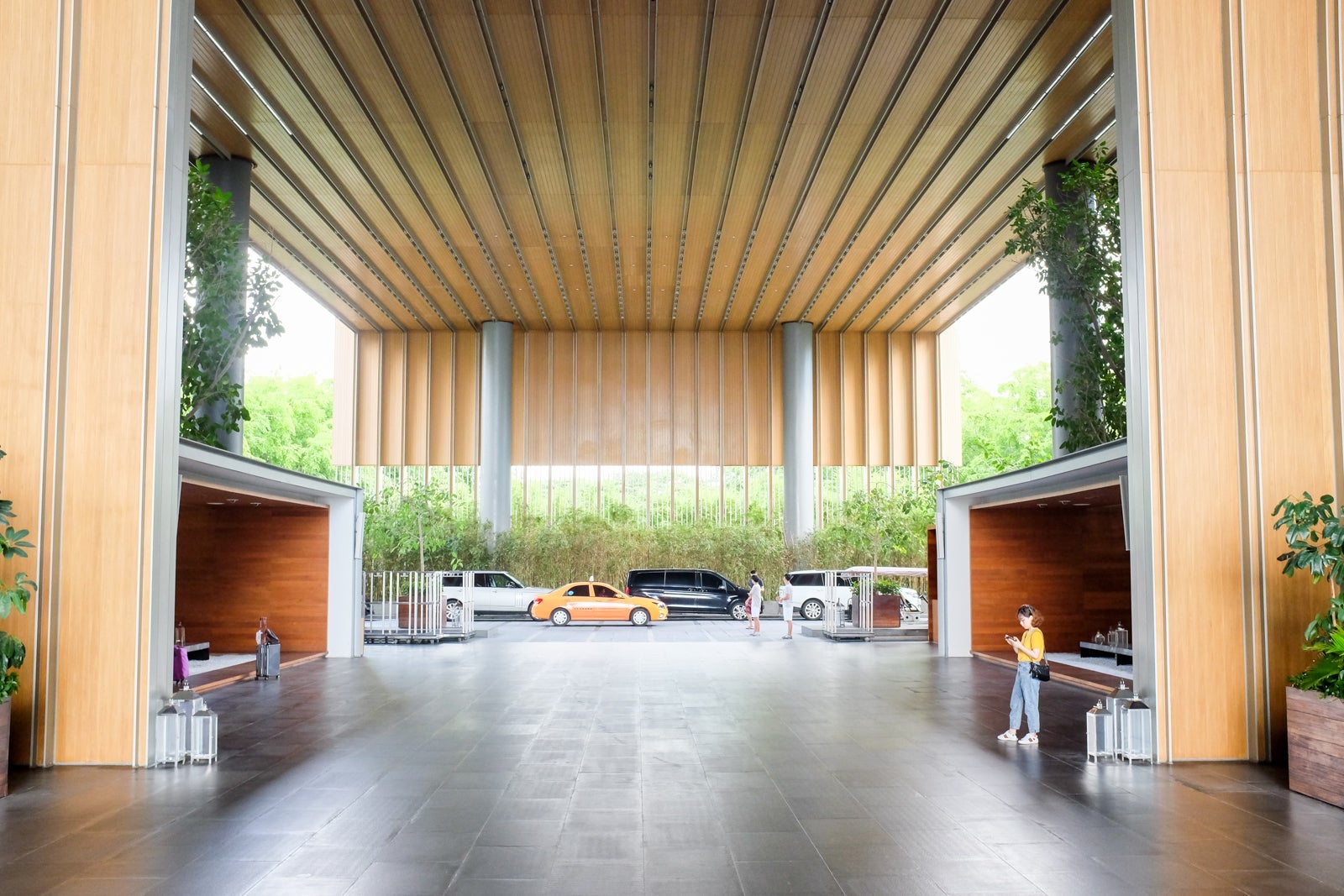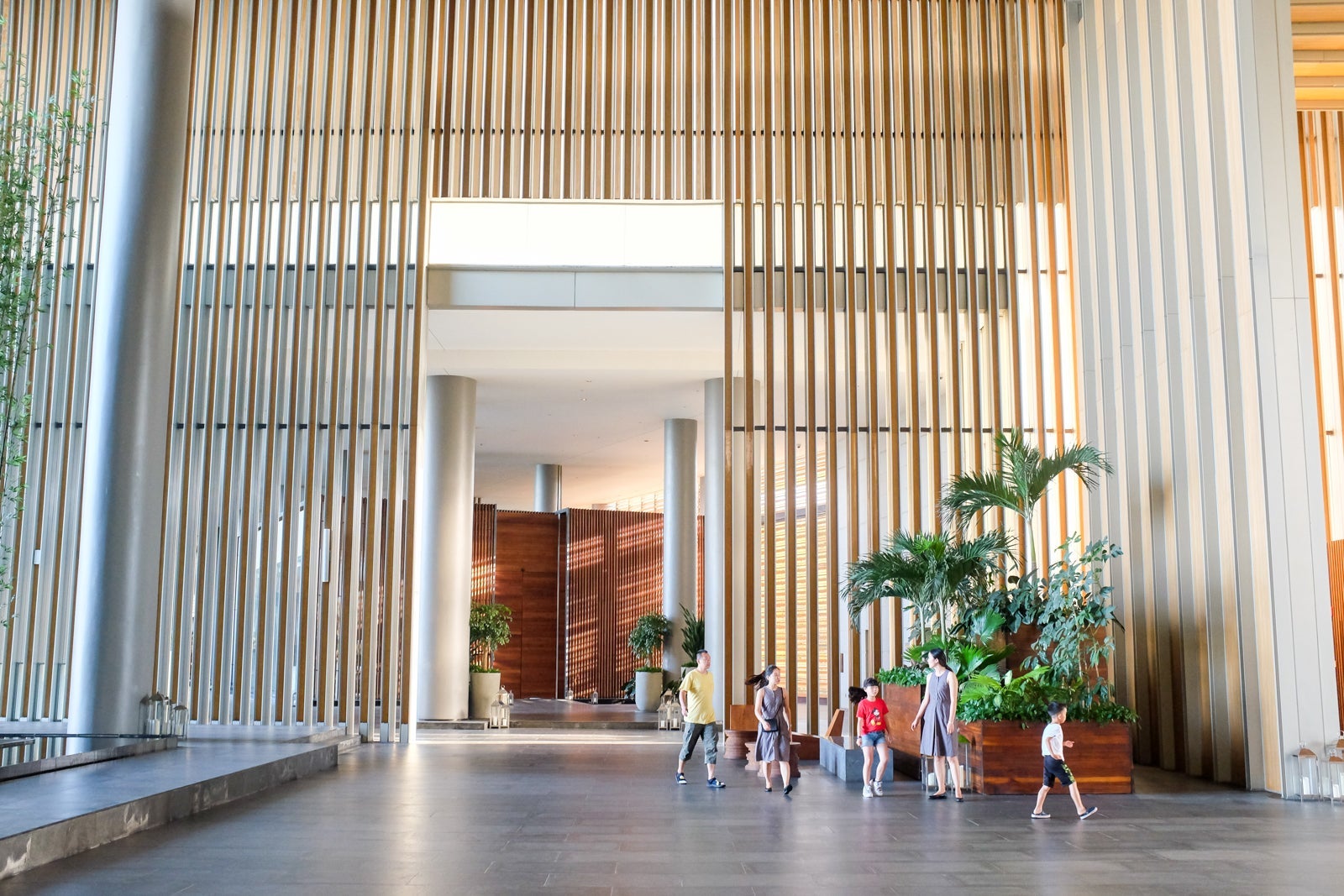 The primary pickup and drop-off area led us straight into a majestic, open-air lobby with 50-foot high ceilings and bamboo panels throughout.