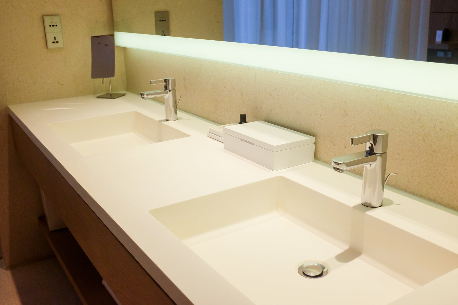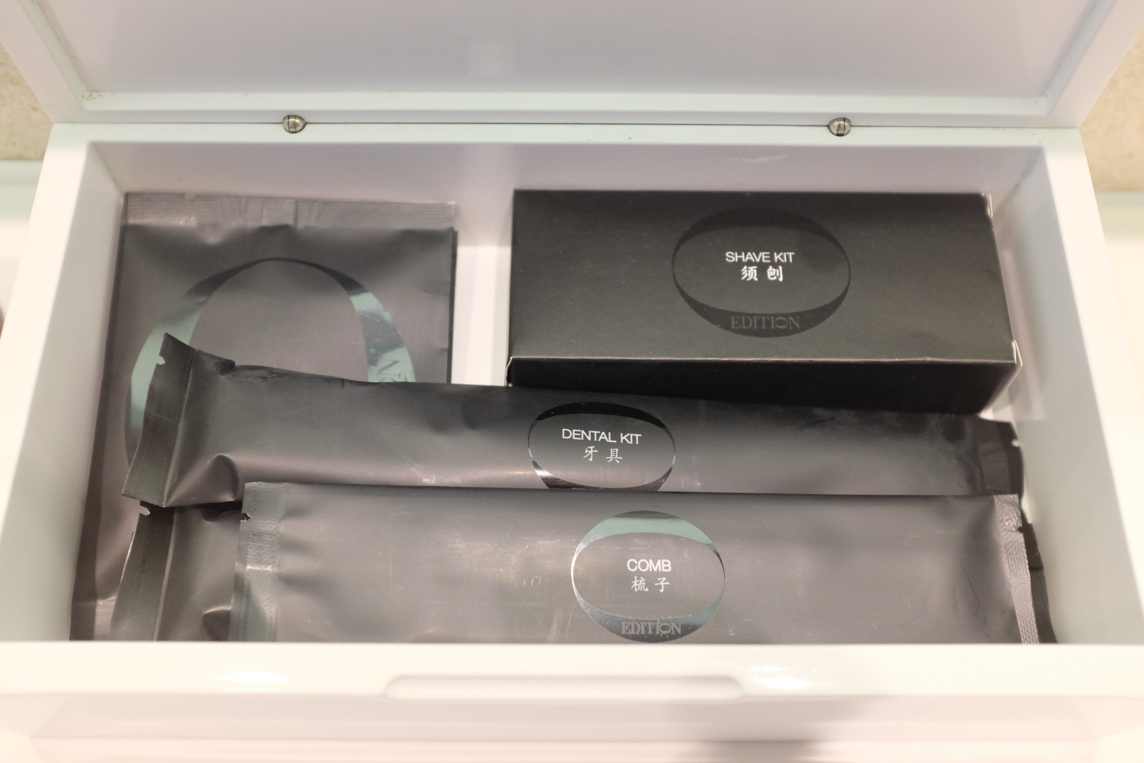 The countertop had two sinks, soap, lotion and a small amenity box containing shaving and dental kits.