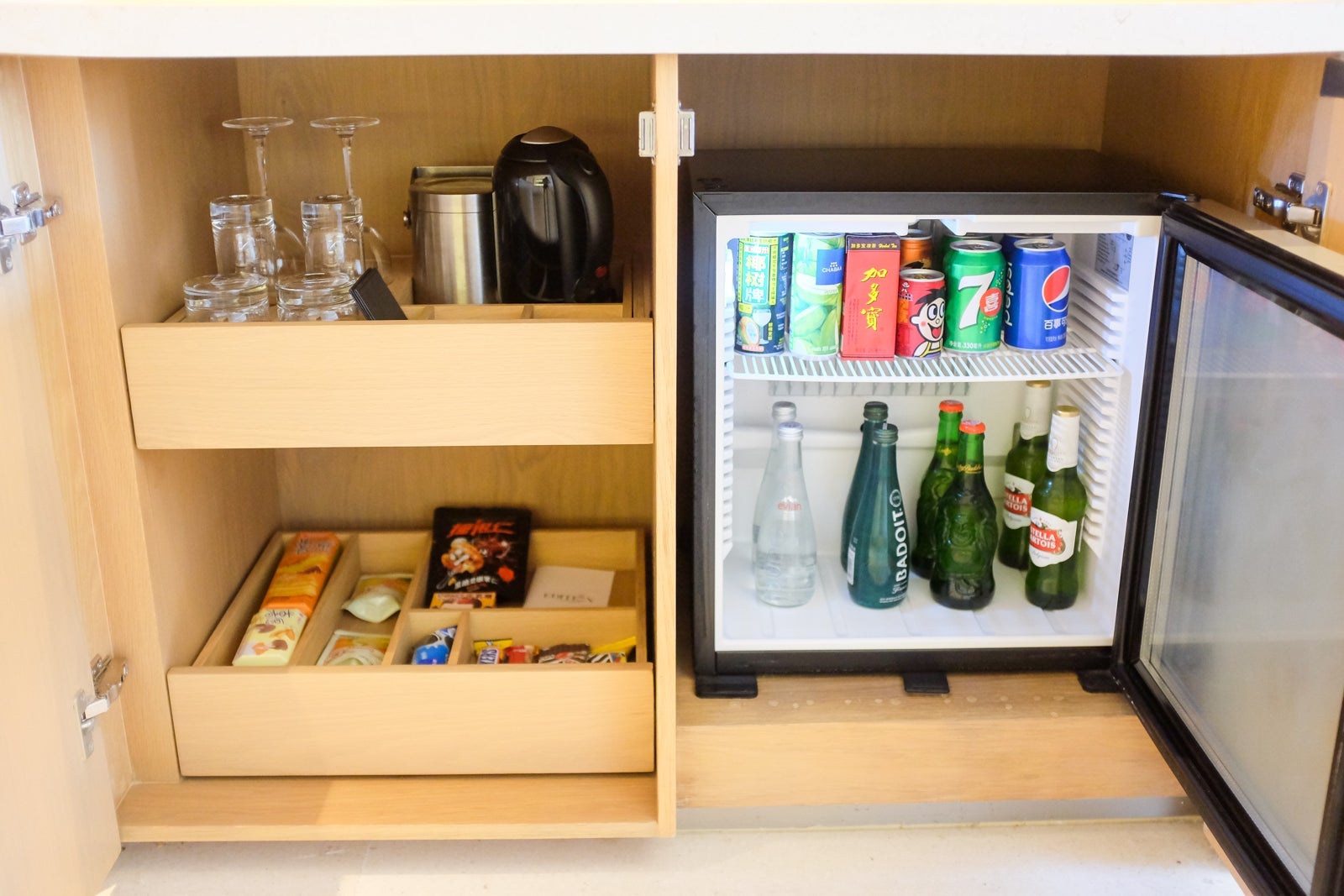 While the minibar had a standard variety of snacks, sodas and alcoholic beverages.