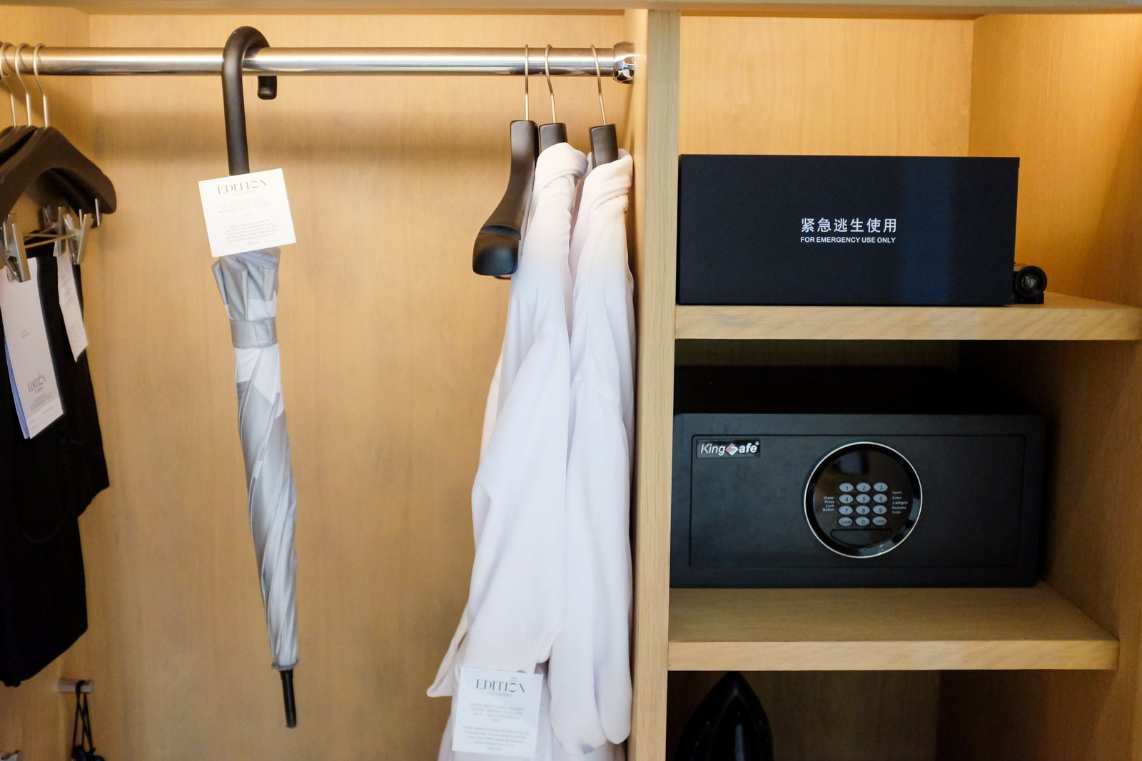 The closet was pretty standard. It included a safe, a steamer, two bathrobes and an umbrella.