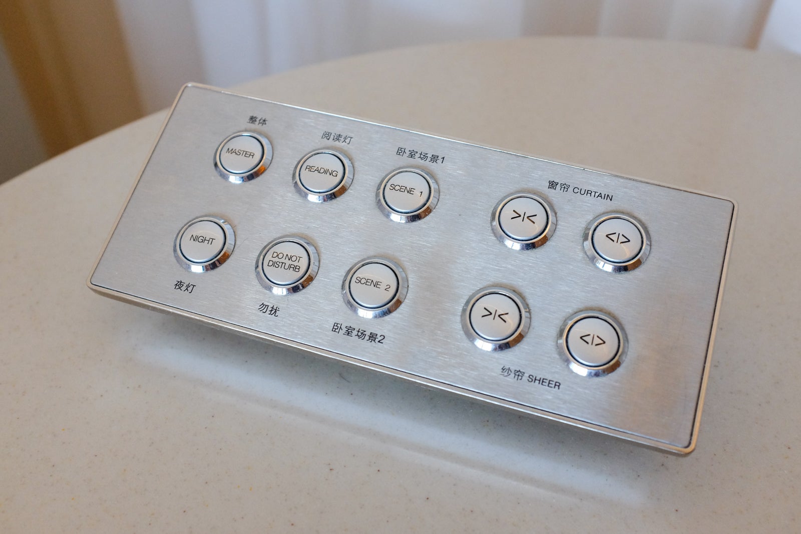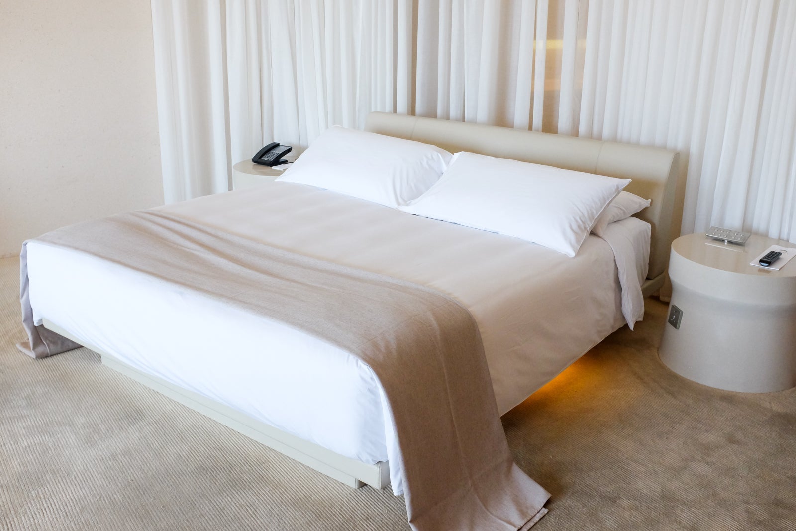 The king bed had a circular curtain behind it that separated it from the bathroom behind. A convenient light illuminated the floor area around the bed for easier navigation at night. The two nightstands on either side were equipped with power outlets and a control pad for the room's lighting fixtures.