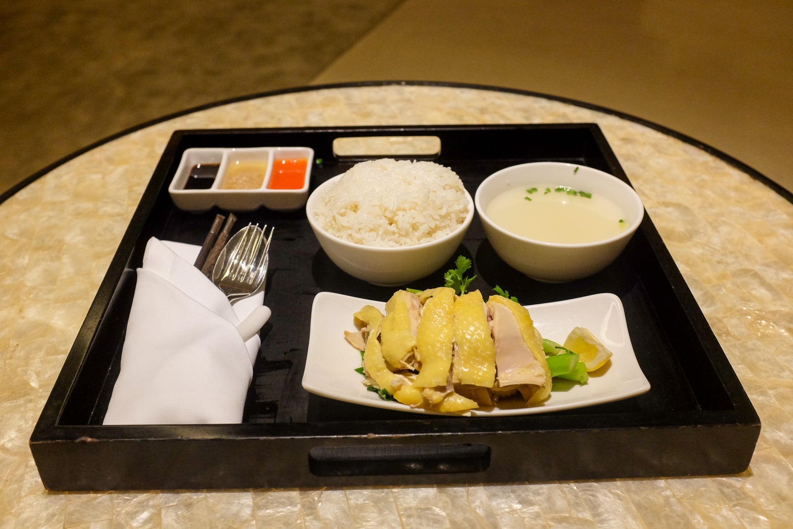 The one meal I had from room service was the classic dish Hainanese chicken rice, which was flavorful and perfectly tender. The service was both speedy and efficient.