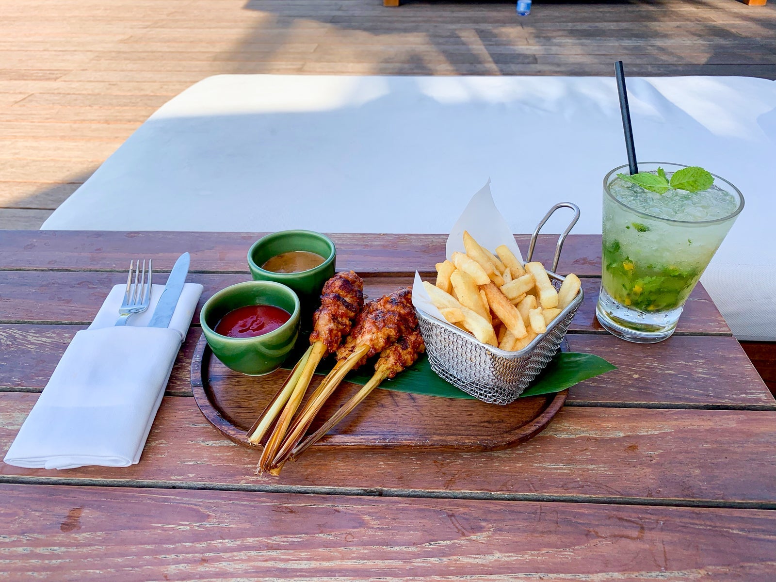 I tried the seasoned fish skewers and a passion fruit cocktail, both of which were superb.