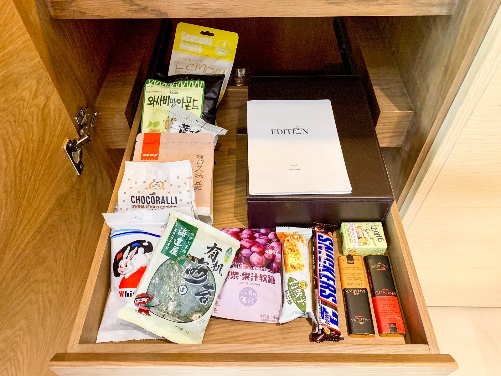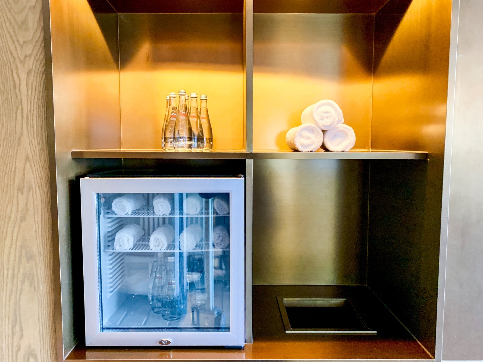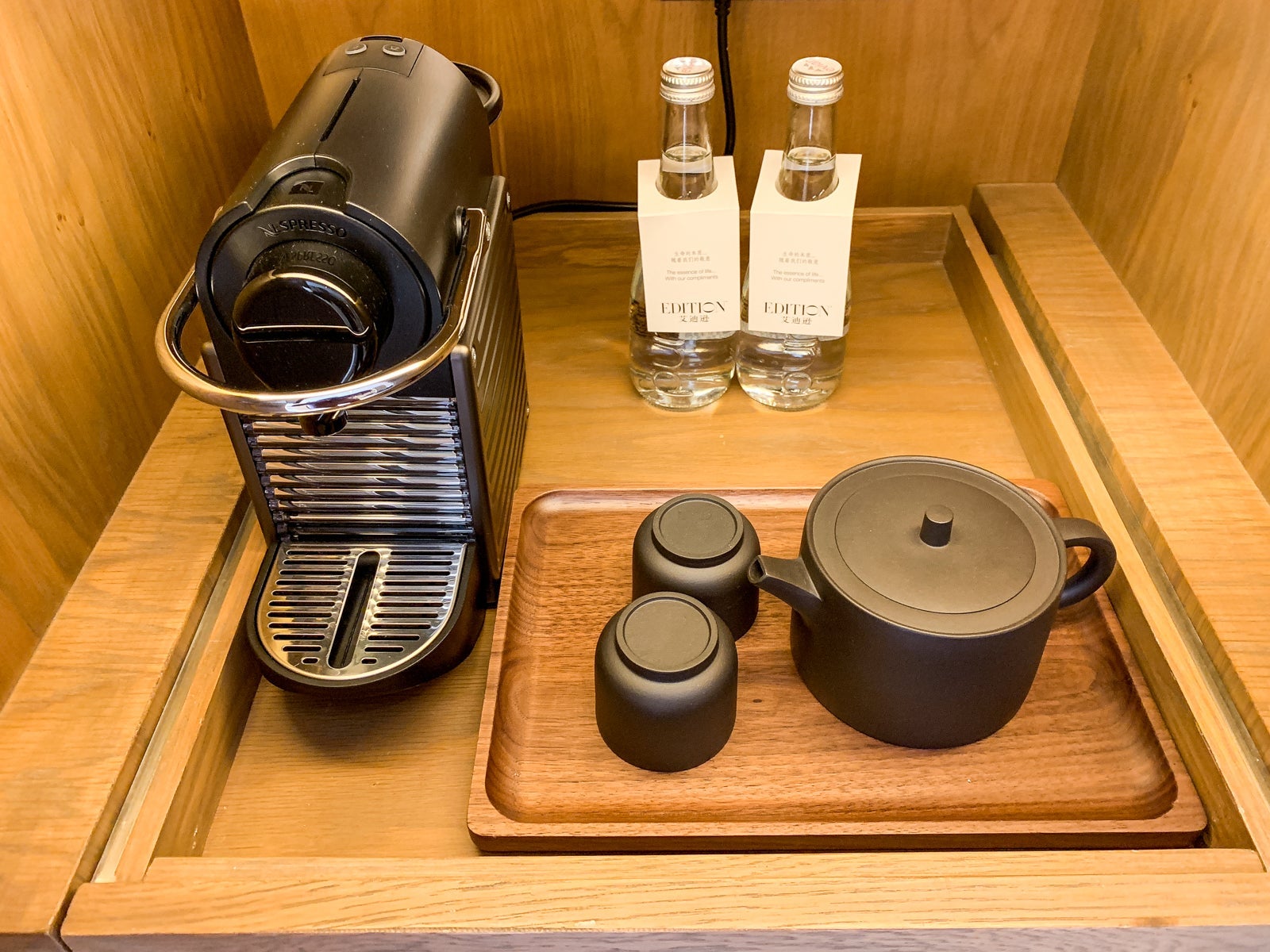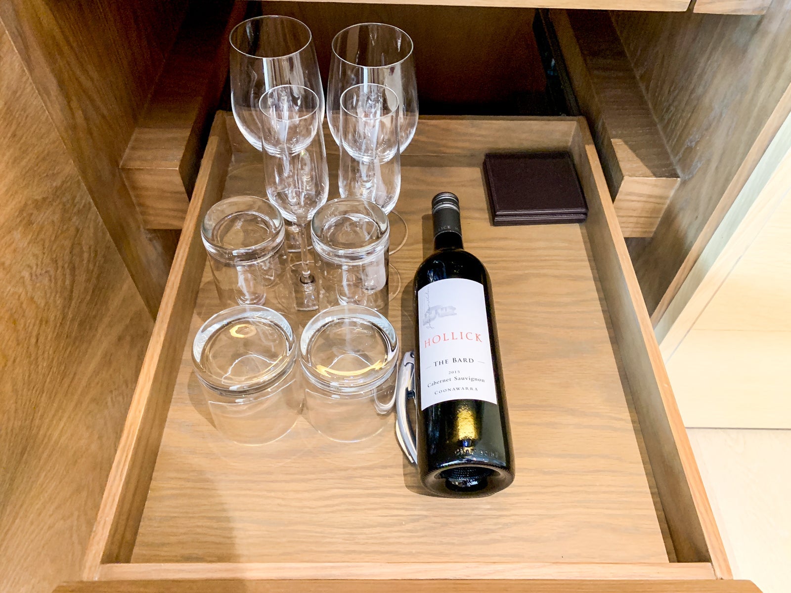 Under the closet were drawers that contained the room's Nespresso machine, a couple of complimentary water bottles (I never had to break into those, though, since housekeeping was so generous with restocking water), a bottle of red wine and four glasses, a stocked minifridge and a selection of snacks.